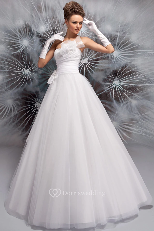 A-Line Ball-Gown Floor-Length Sleeveless Floral Strapless Tulle Wedding Dress With Appliques And Ruching