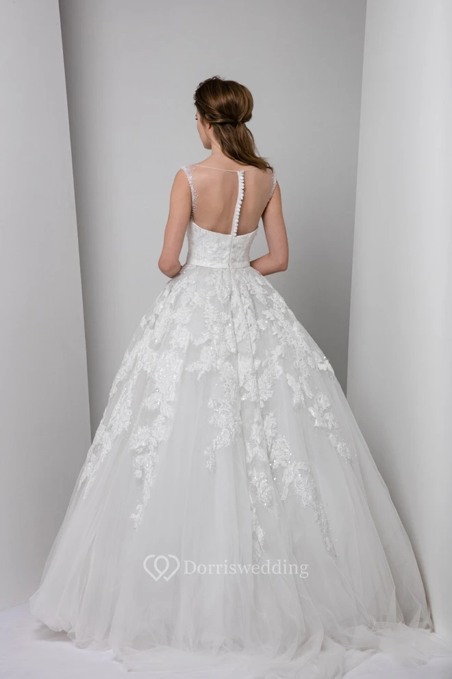 A-Line Ball-Gown Sleeveless Floor-Length Appliqued Bateau Tulle Wedding Dress With Illusion Back And Ruffles