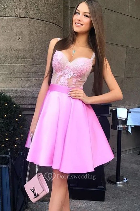 A-line Ball Gown Sleeveless Satin Lace Straps Short Mini Homecoming Dress