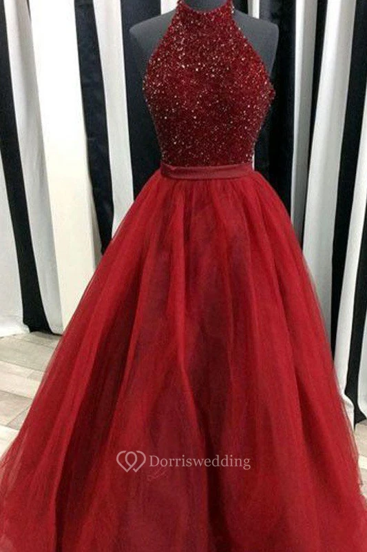 A-Line Ball Gown Tulle Sequins Halter Sleeveless Zipper Dress