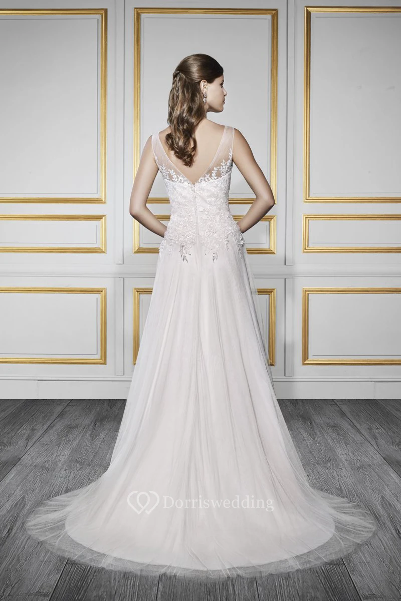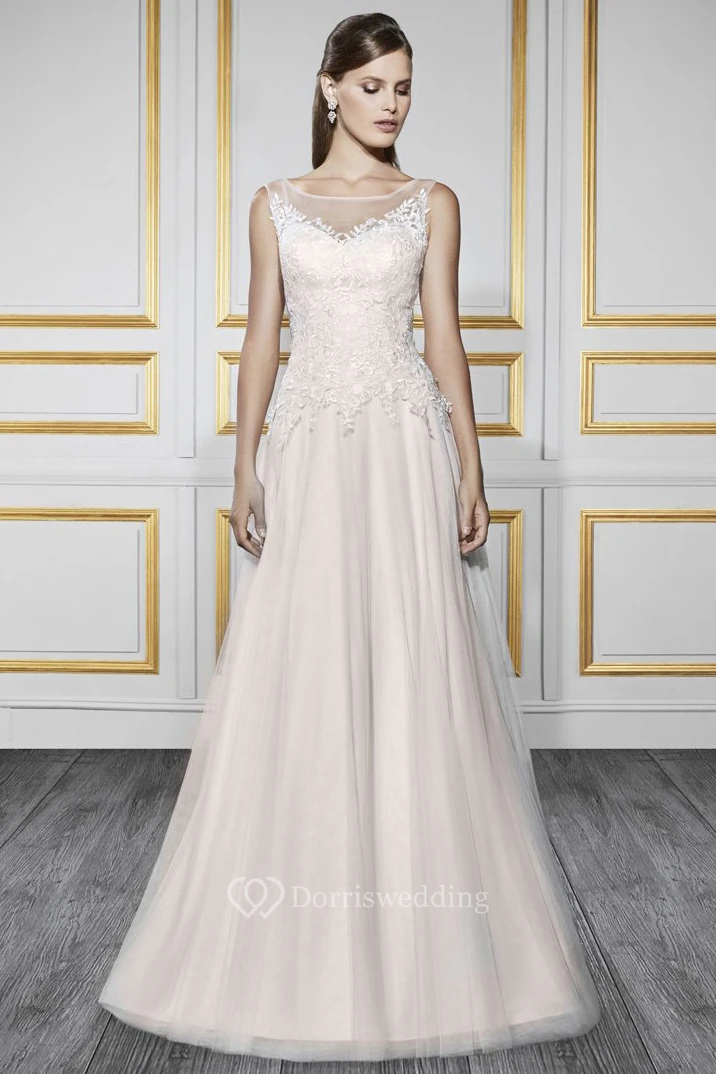 A-Line Bateau Appliqued Floor-Length Sleeveless Lace&Tulle Wedding Dress With Court Train And Low-V Back