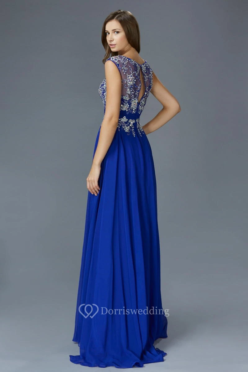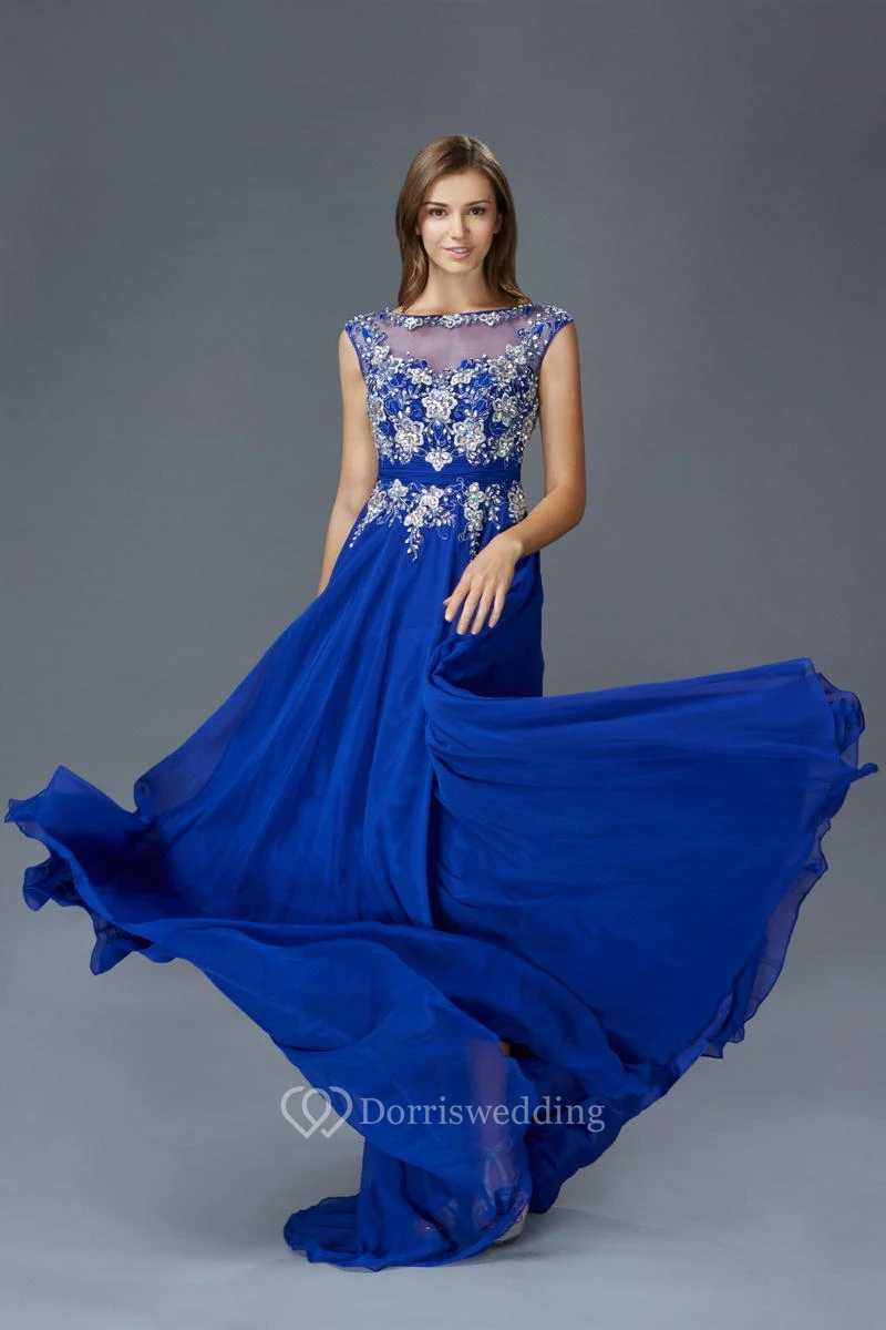 A-Line Bateau Cap-Sleeve Chiffon Dress With Appliques And Pleats