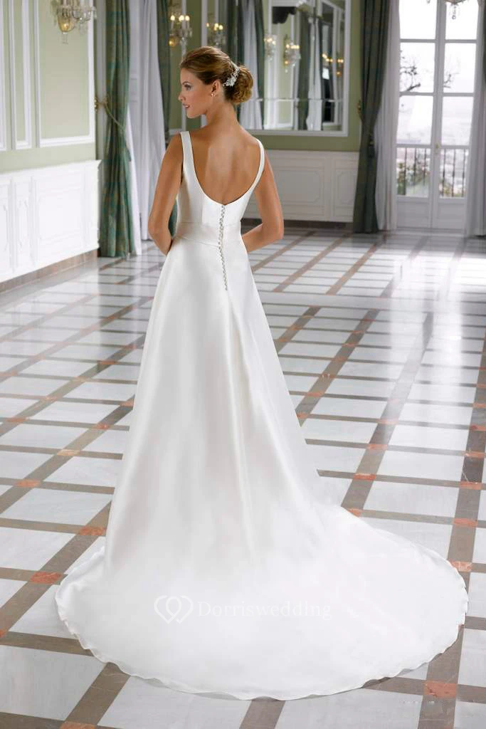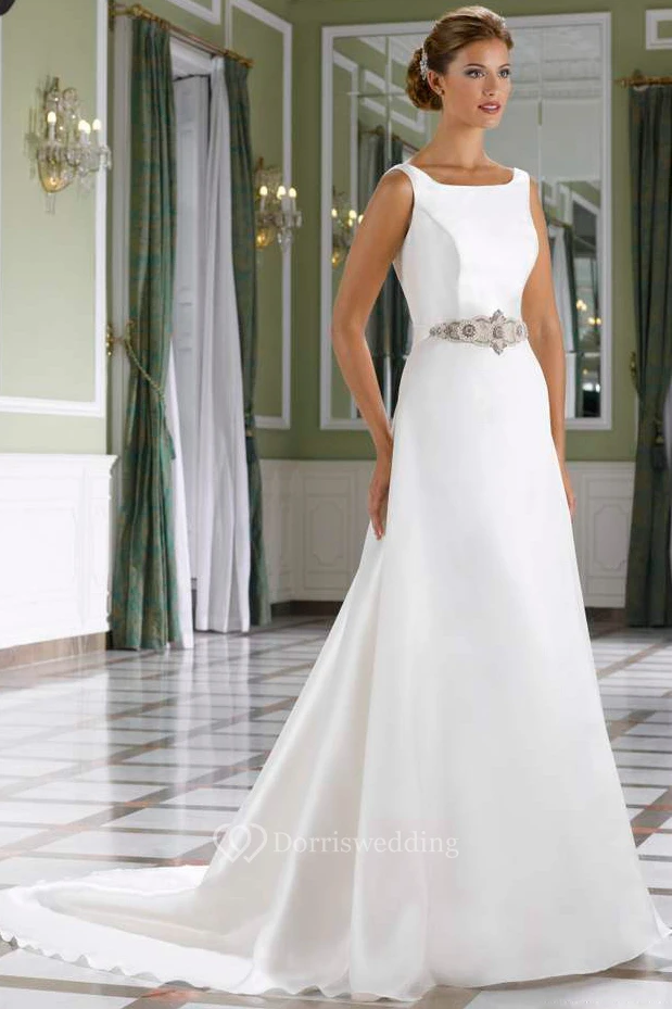 A-Line Bateau Long Jeweled Sleeveless Satin Wedding Dress With Court Train And Low-V Back
