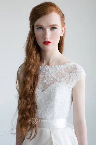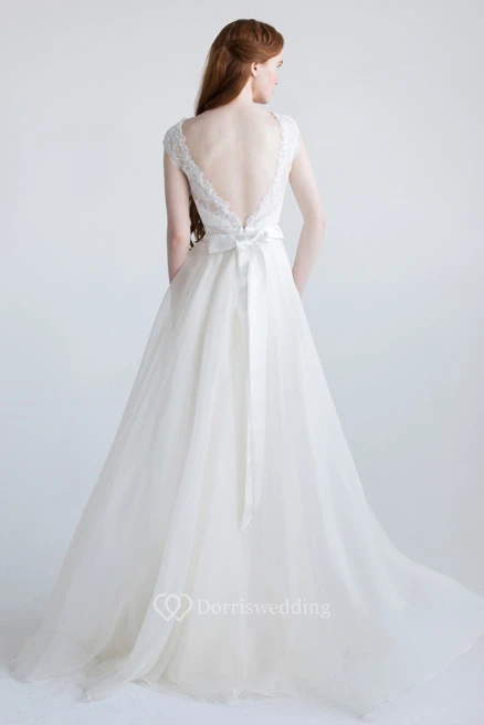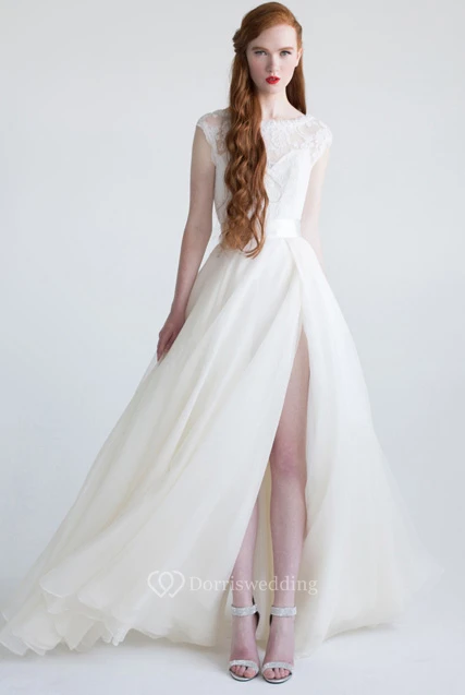 A-Line Bateau-Neck Cap-Sleeve Split-Front Floor-Length Tulle Wedding Dress With Appliques And Bow