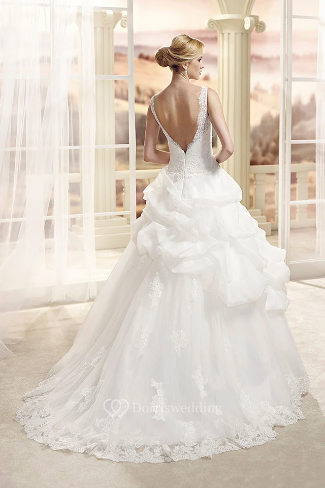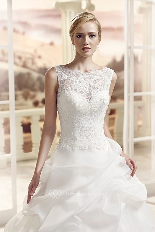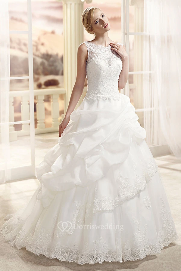 A-Line Bateau-Neck Floor-Length Sleeveless Pick-Up Lace&Organza Wedding Dress With Appliques