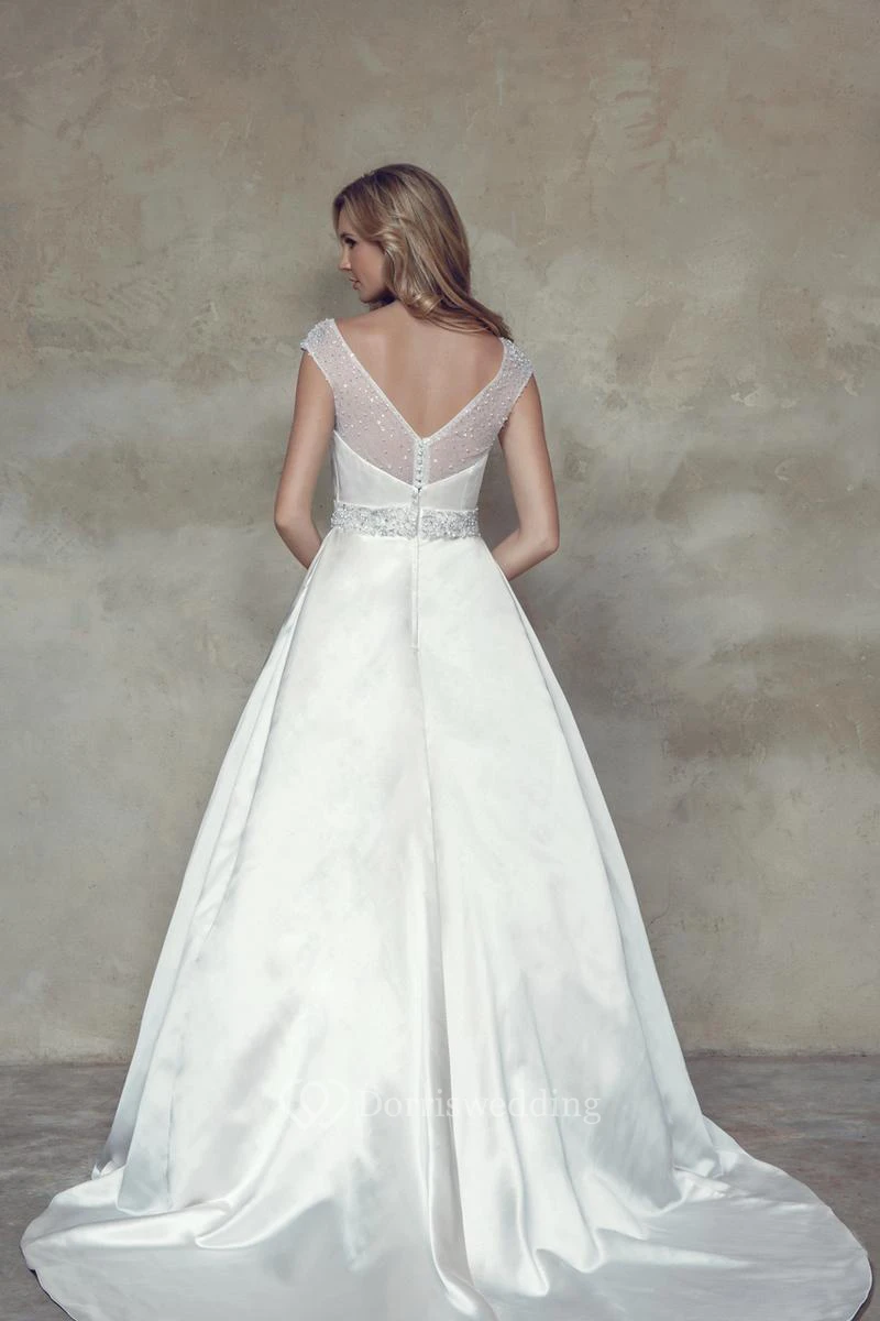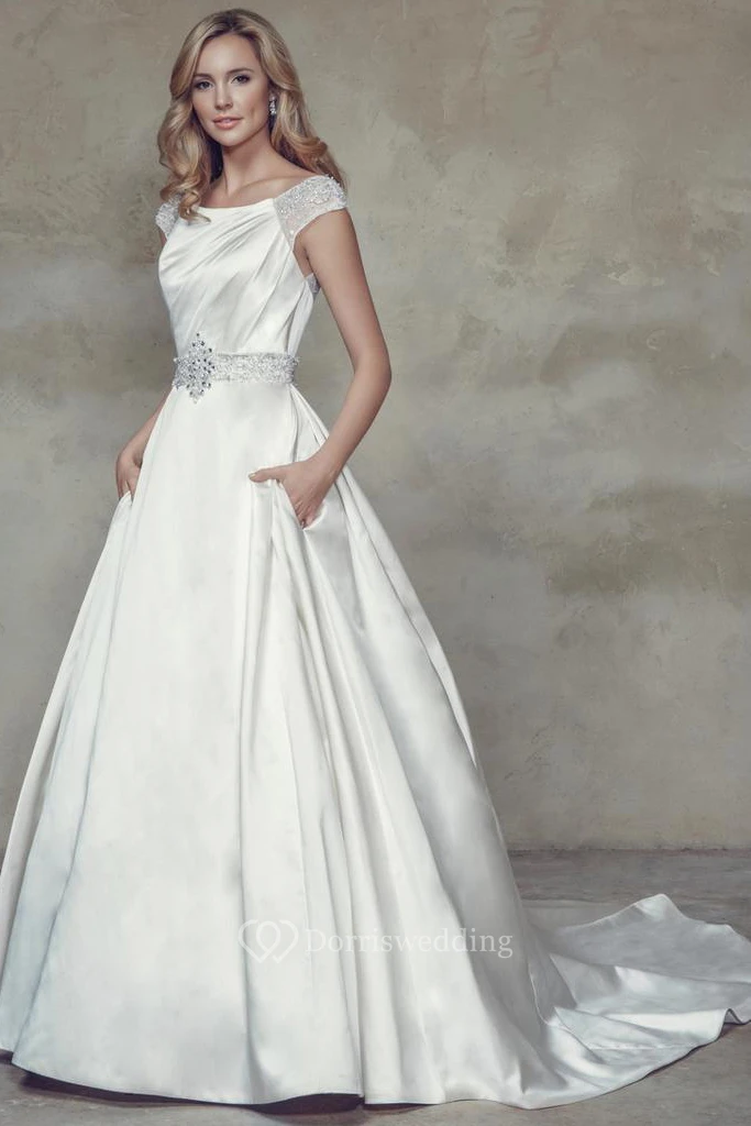 A-Line Bateau-Neck Jeweled Cap-Sleeve Maxi Satin Wedding Dress With Beading And V Back