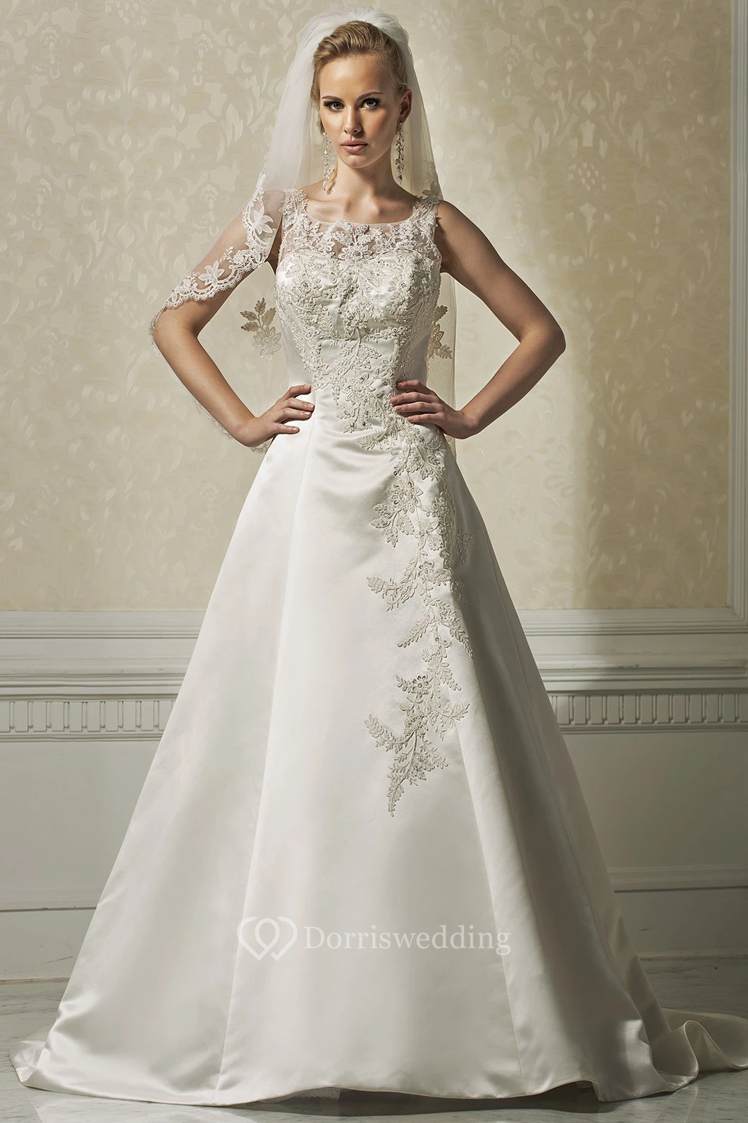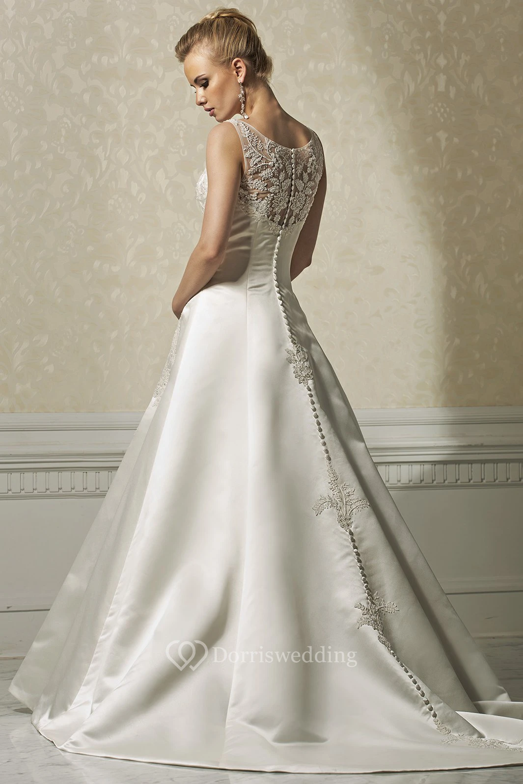 A-Line Bateau-Neck Maxi Sleeveless Appliqued Satin Wedding Dress