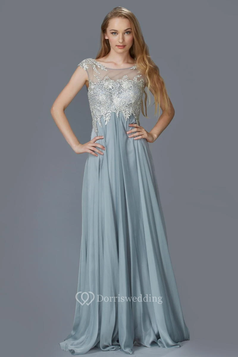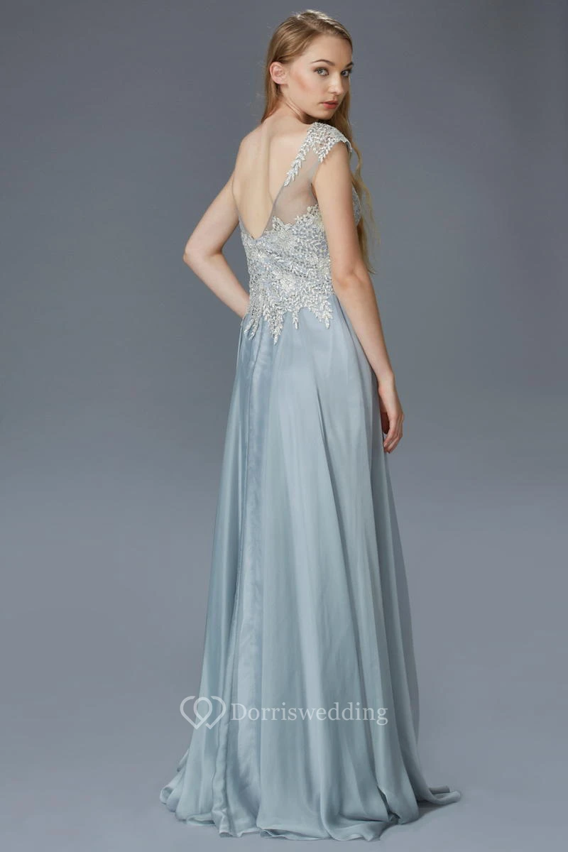 A-Line Bateau Short Sleeve Chiffon Low-V Back Dress With Appliques And Pleats