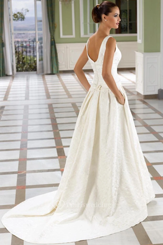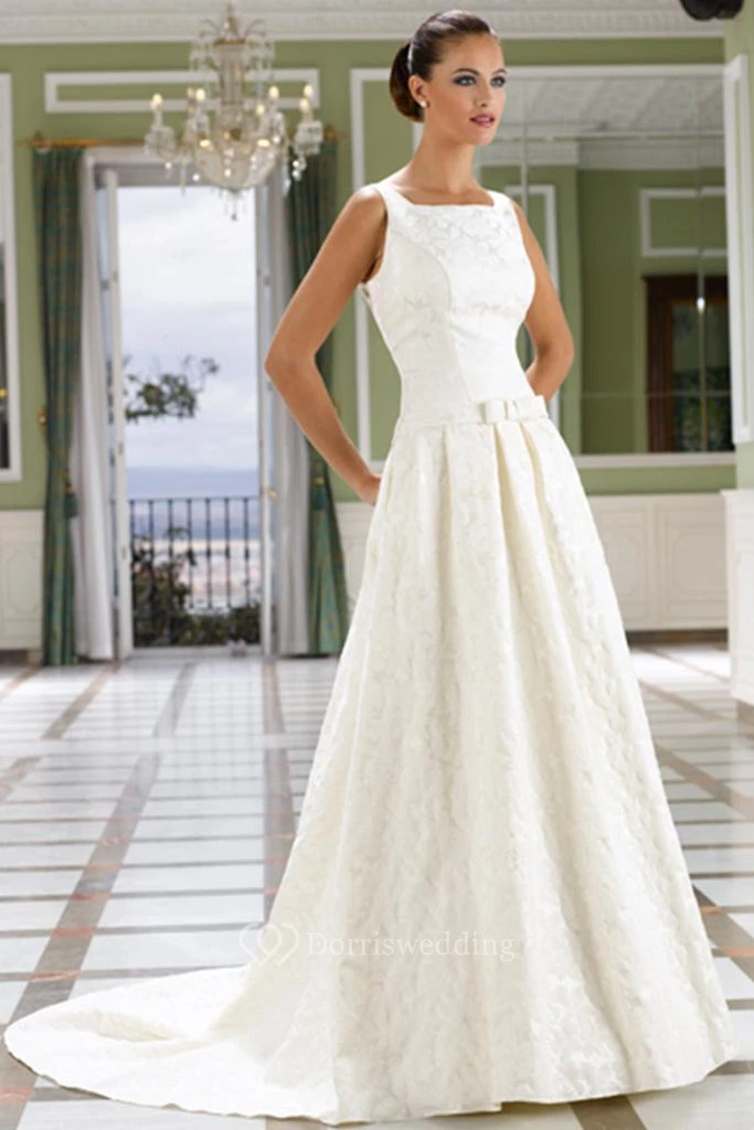 A-Line Bateau Sleeveless Maxi Bowed Lace Wedding Dress With Court Train And Low-V Back