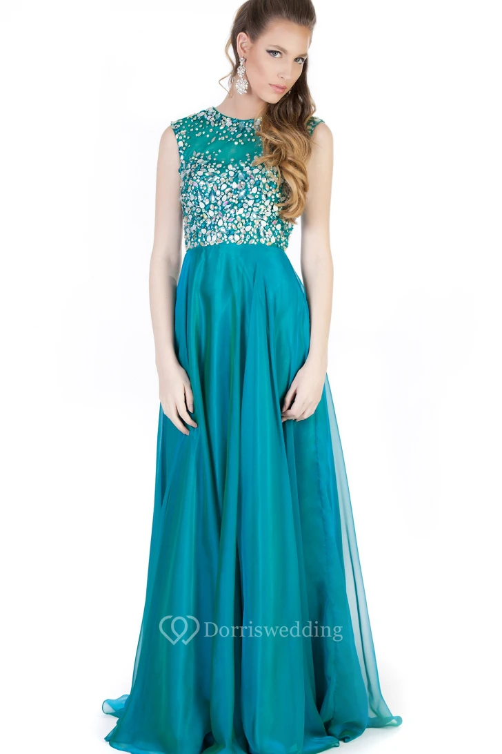 A-Line Beaded High-Neck Maxi Sleeveless Evening Dress With Pleats