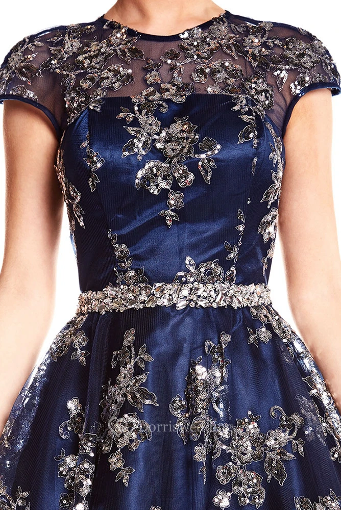 A-Line Beaded Jewel Cap-Sleeve Mini Satin Prom Dress With Keyhole Back And Waist Jewellery