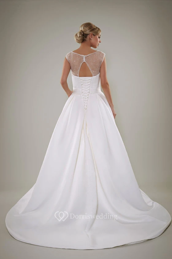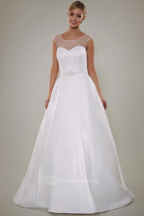 A-Line Beaded Scoop Floor-Length Cap-Sleeve Satin Wedding Dress With Keyhole Back And Waist Jewellery