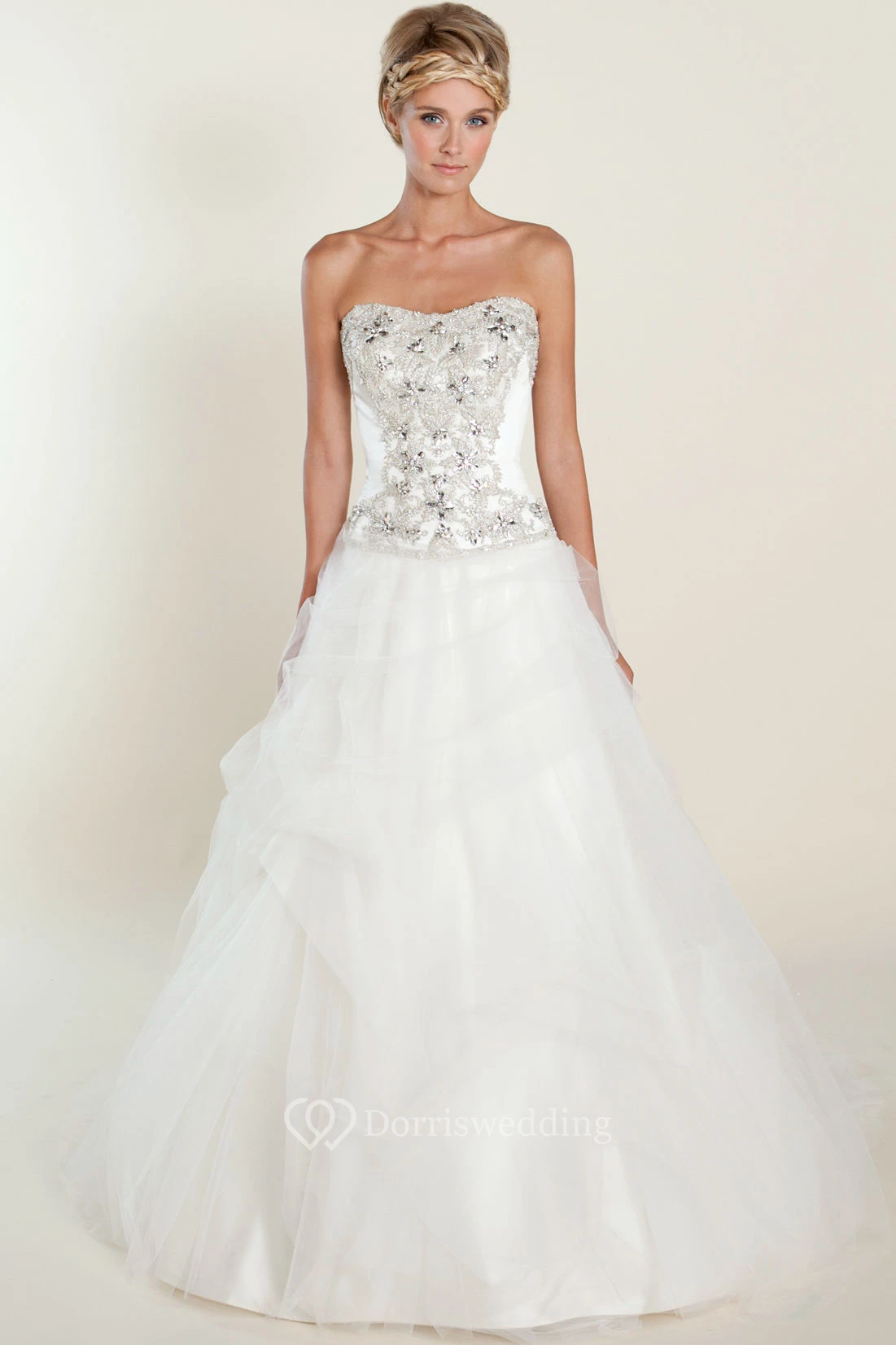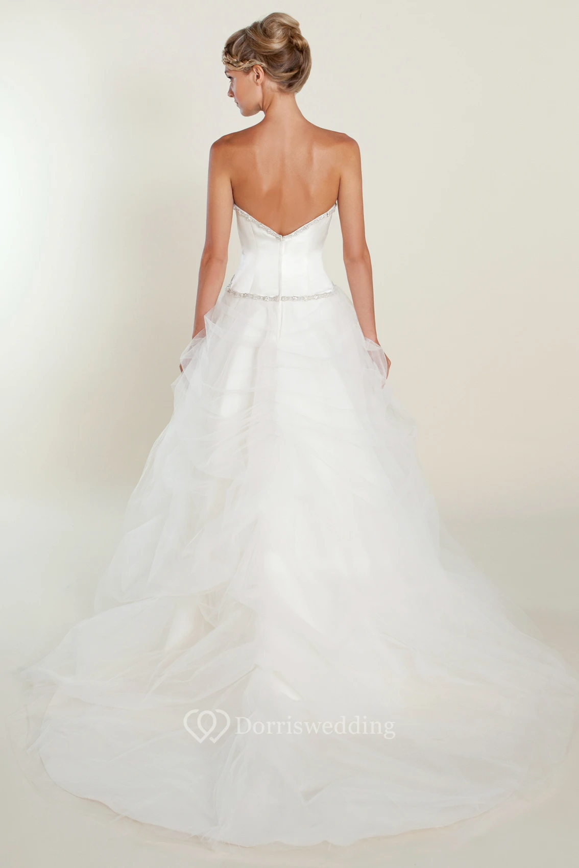 A-Line Beaded Sleeveless Floor-Length Strapless Tulle&Satin Wedding Dress With Deep-V Back And Ruffles
