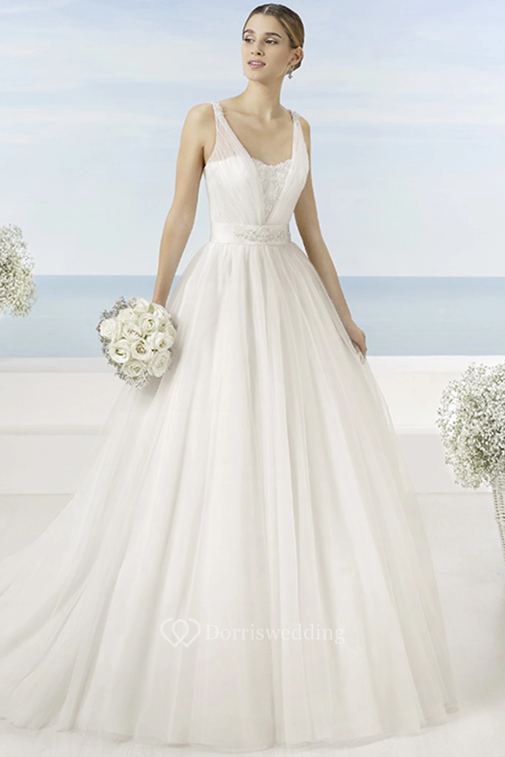 A-Line Beaded Sleeveless Long V-Neck Tulle Wedding Dress With Bow And Low-V Back