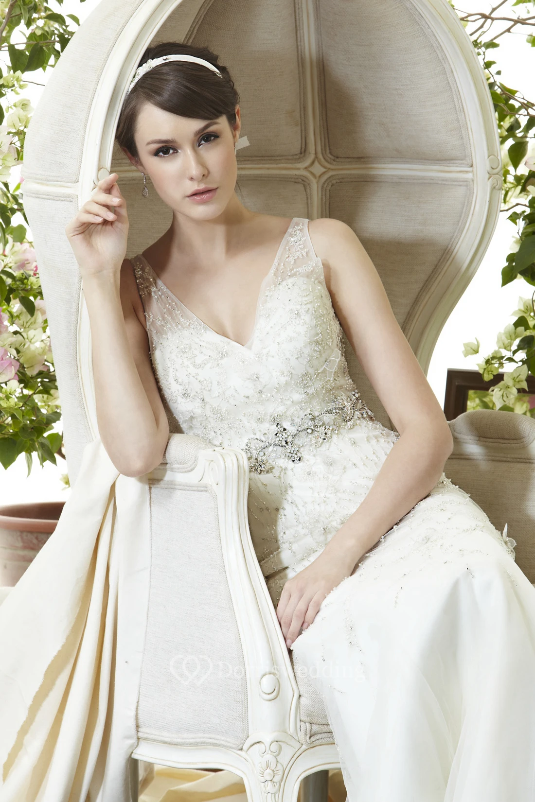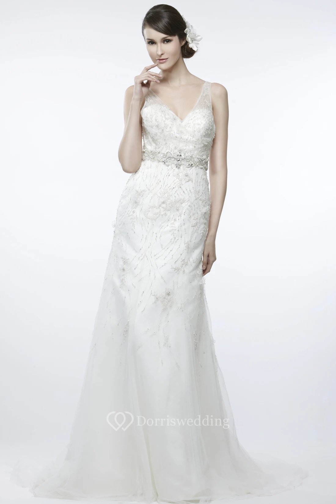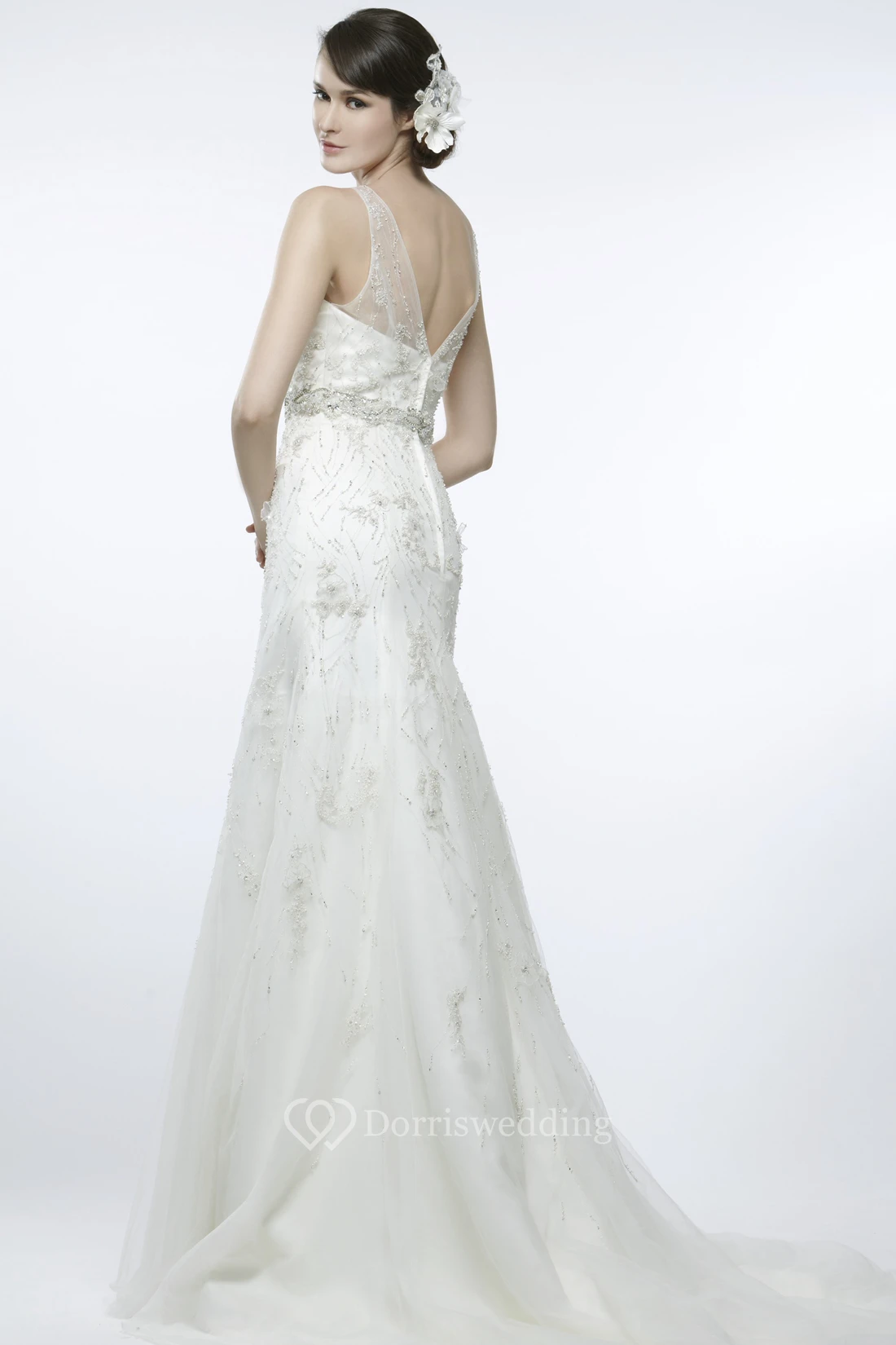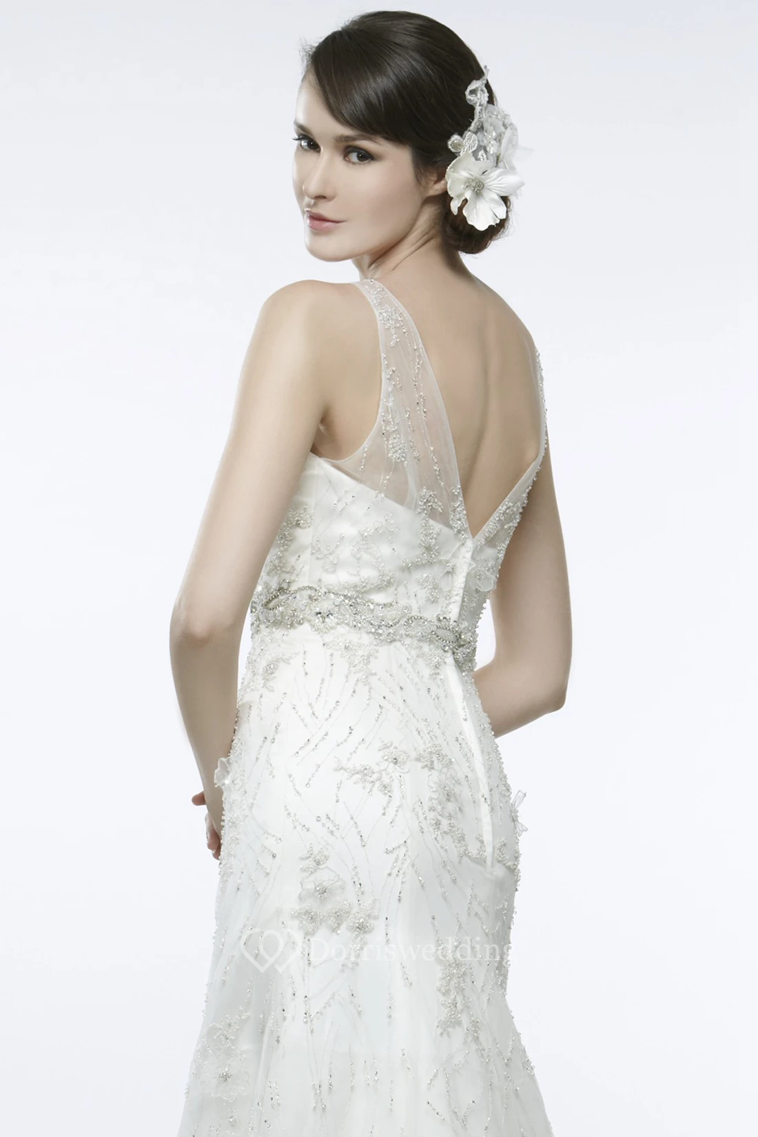 A-Line Beaded Sleeveless V-Neck Maxi Tulle Wedding Dress With Low-V Back And Waist Jewellery