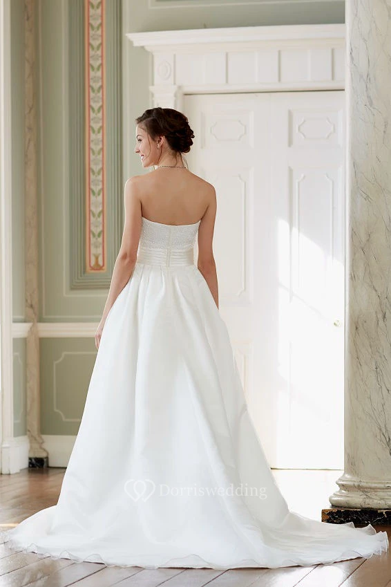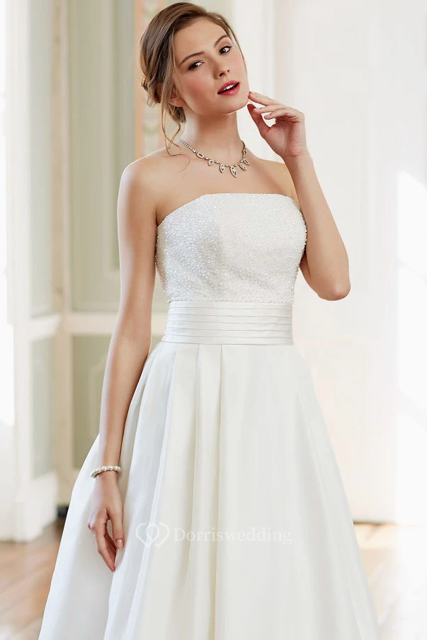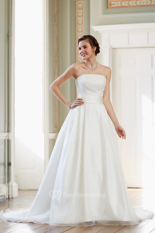 A-Line Beaded Strapless Sleeveless Long Satin Wedding Dress With Backless Style And Court Train