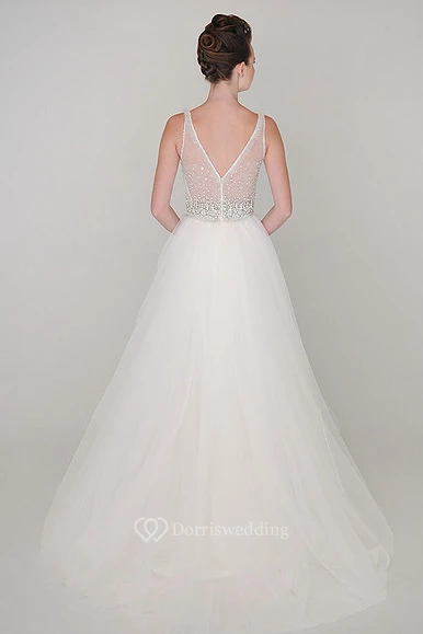 A-Line Beaded V-Neck Floor-Length Sleeveless Tulle Wedding Dress With Waist Jewellery