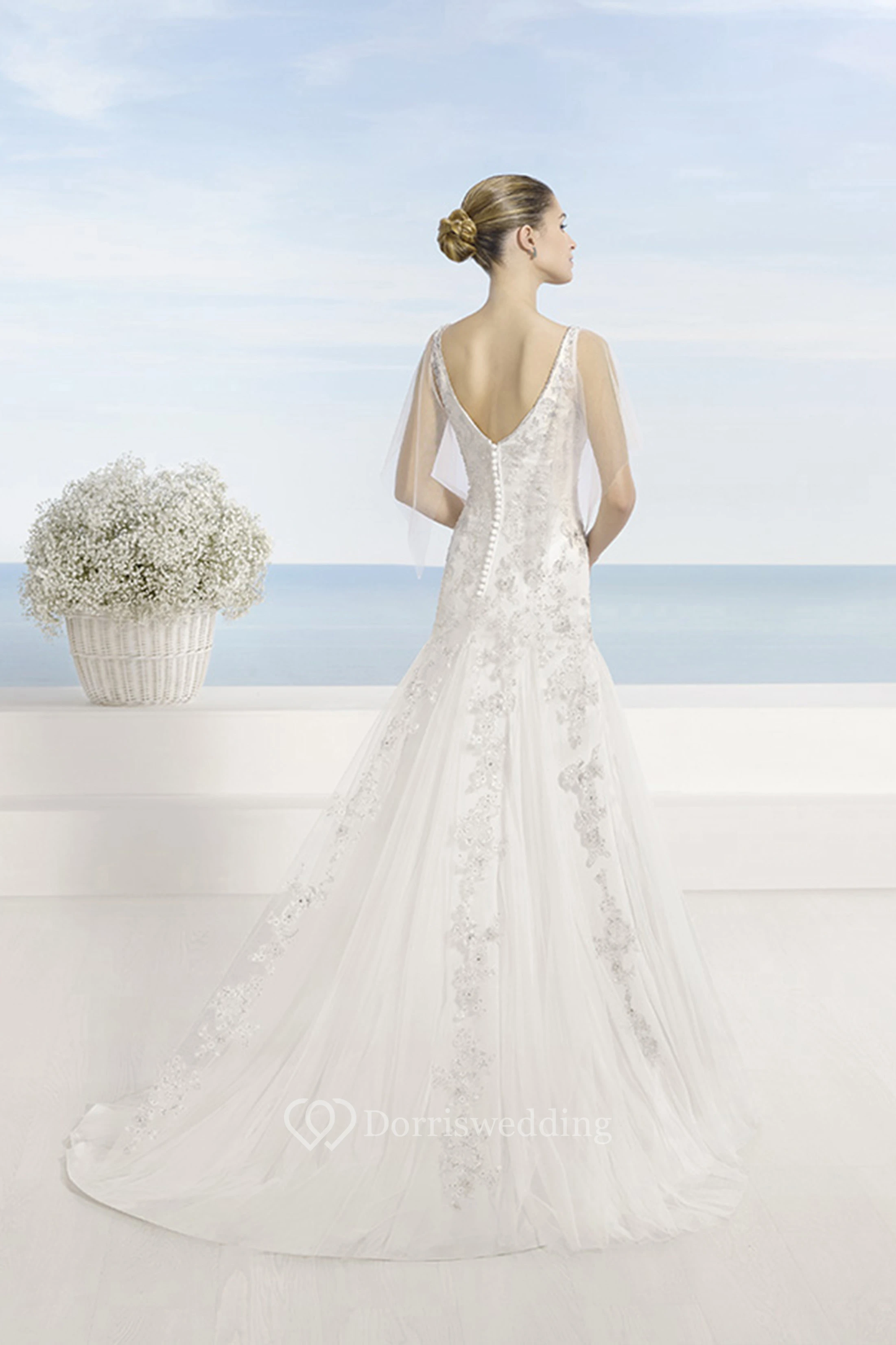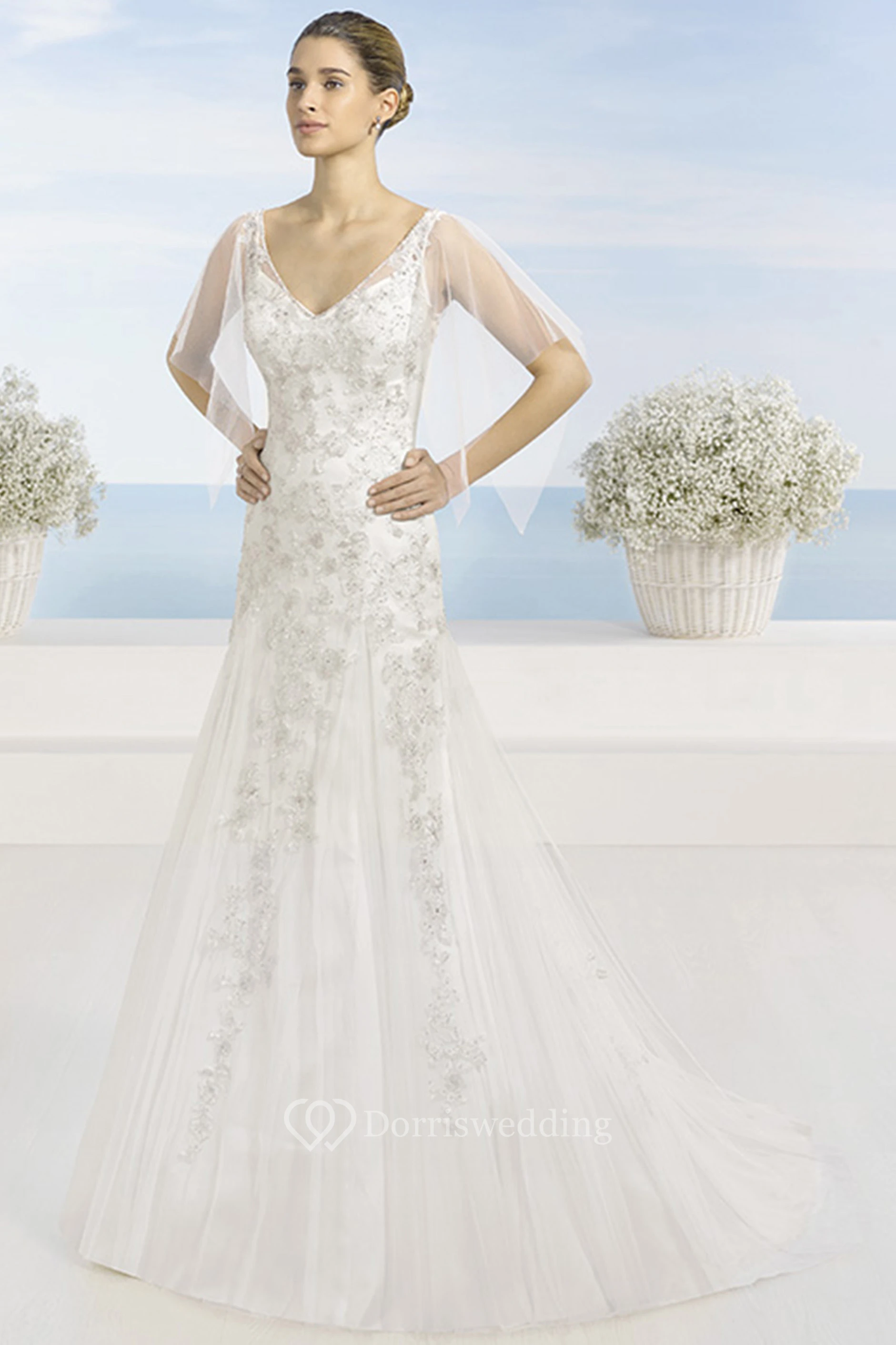 A-Line Beaded V-Neck Floor-Length Tulle Wedding Dress With Cape And Low-V Back