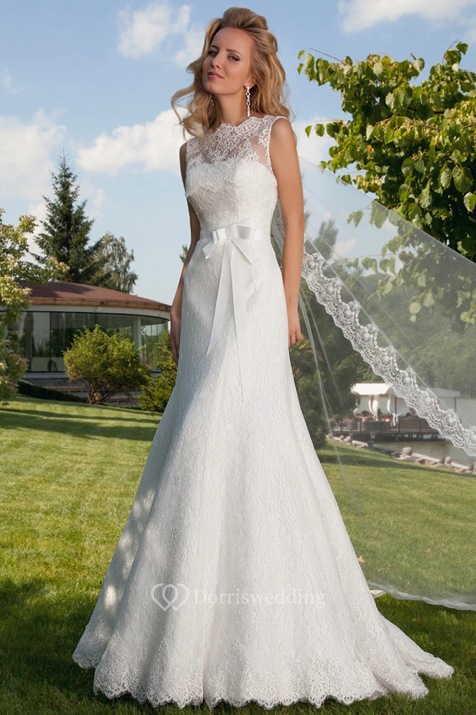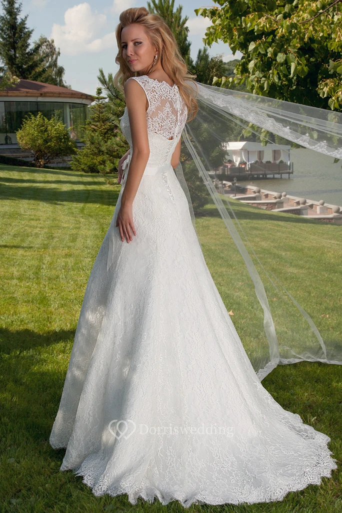 A-Line Bowed Bateau Floor-Length Sleeveless Lace Wedding Dress With Illusion Back And Court Train