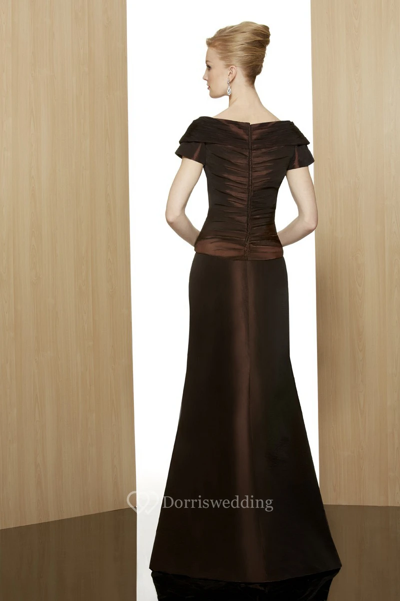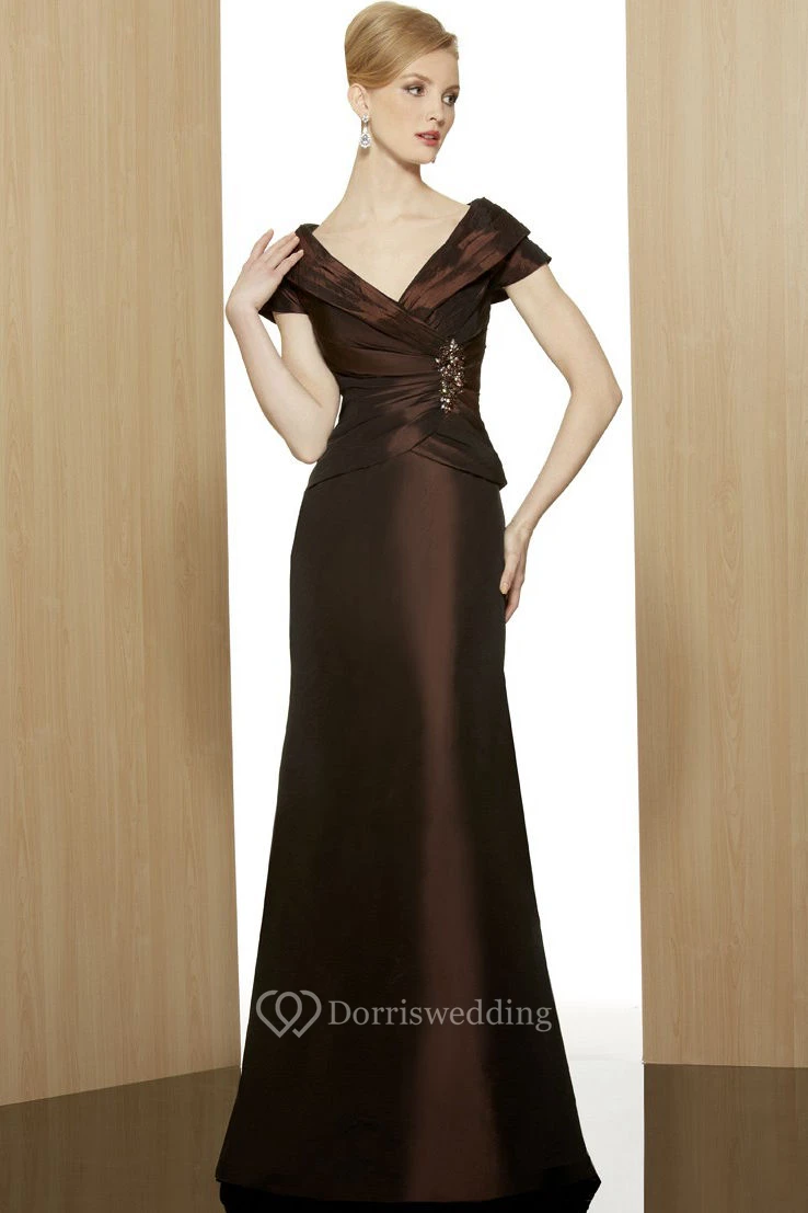 A-Line Broach Short-Sleeve V-Neck Floor-Length Satin Formal Dress With Zipper Back