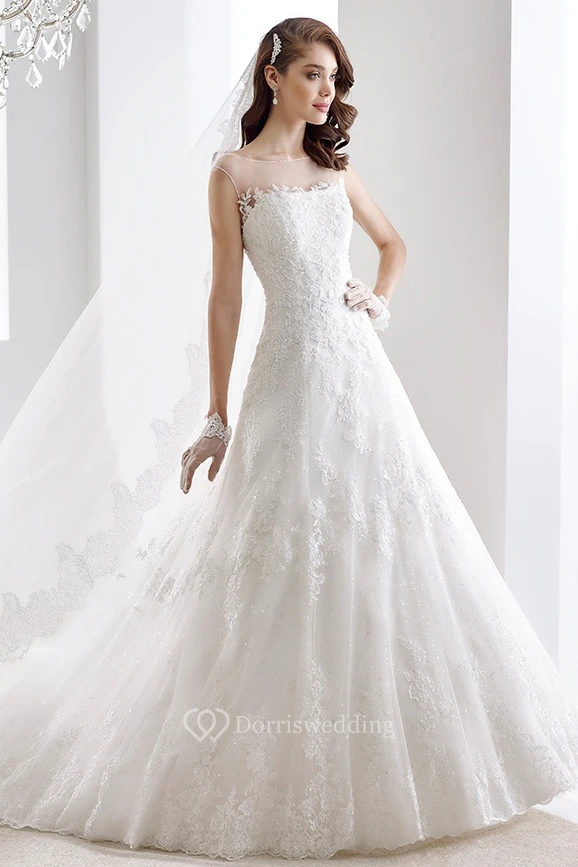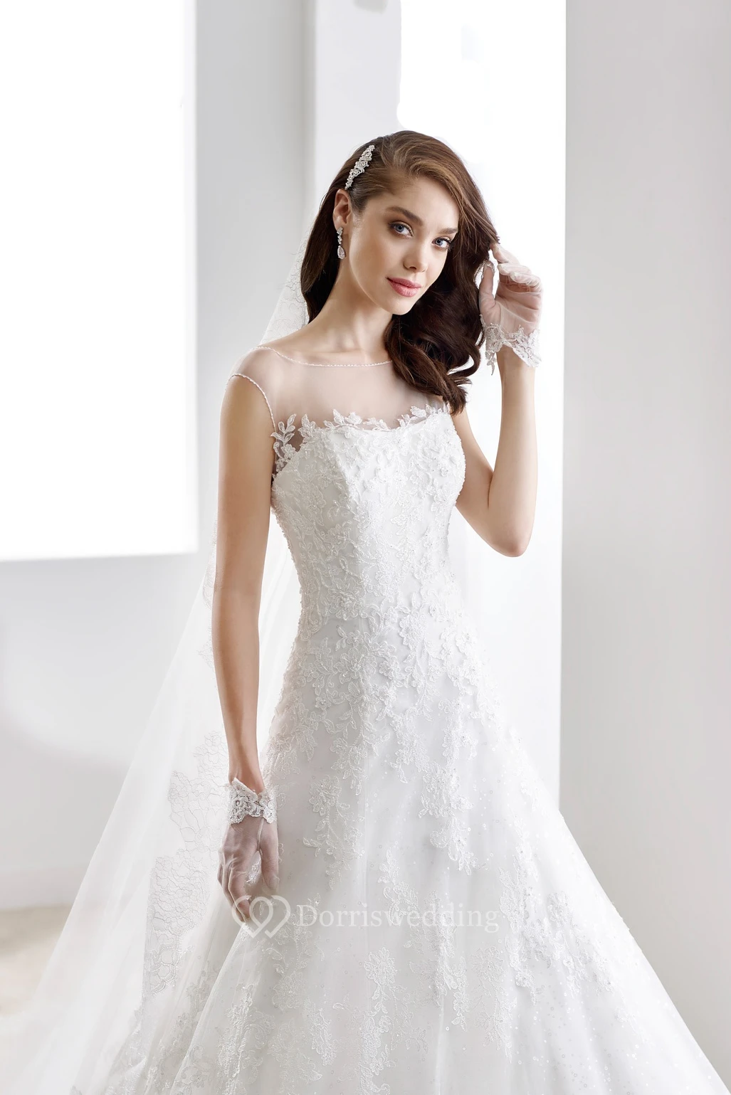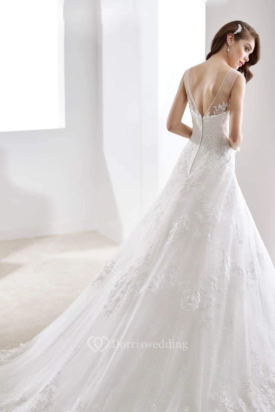 A-Line Brush-Train Lace Gown With Illusive Neckline And V Back