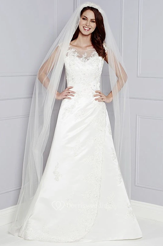 A-Line Cap-Sleeve Appliqued Bateau-Neck Maxi Taffeta Wedding Dress