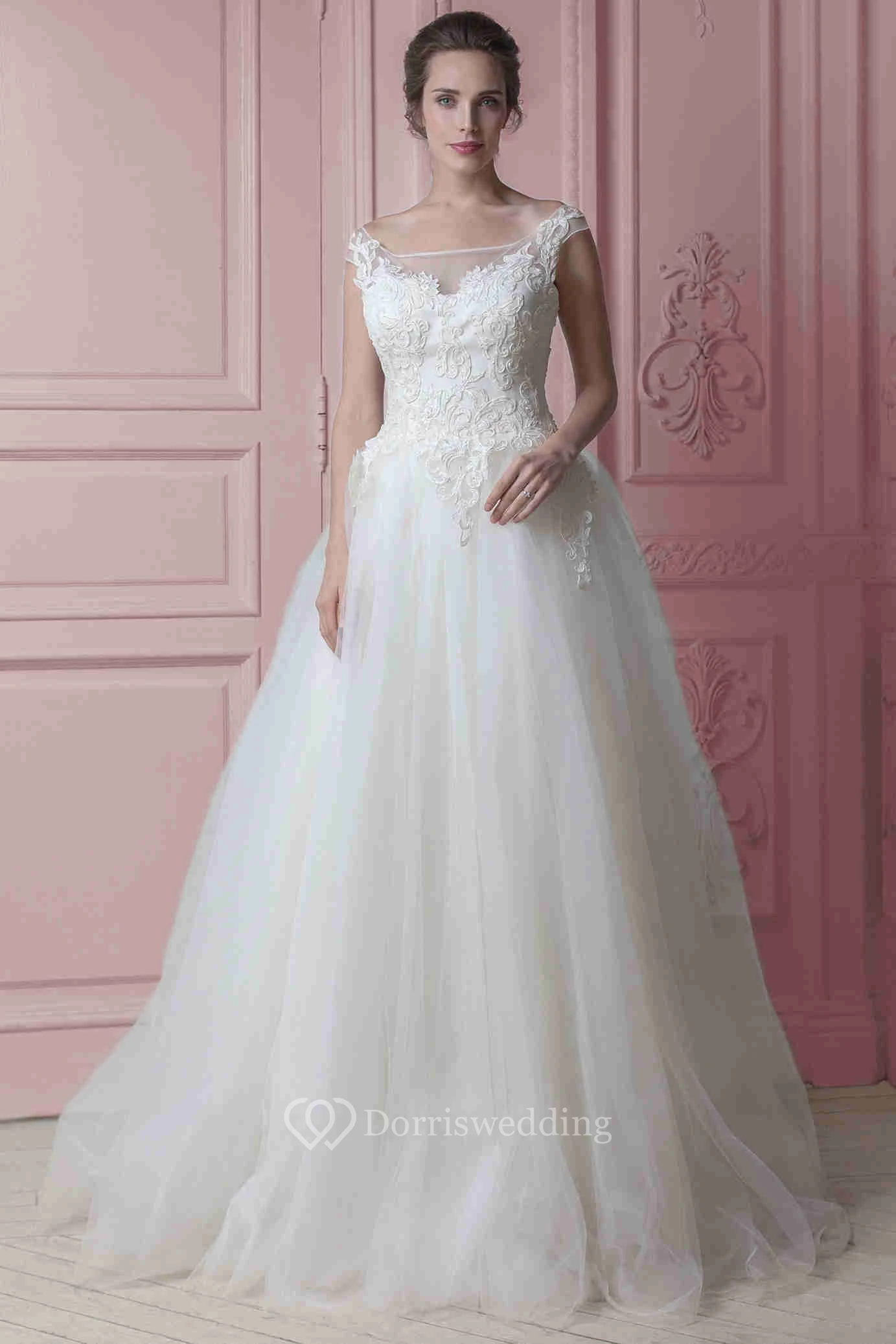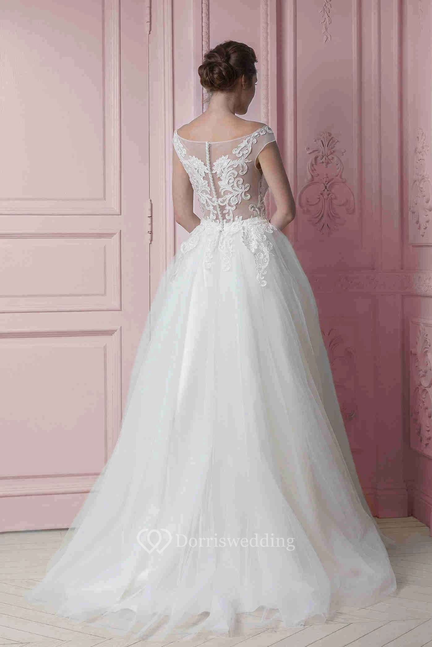 A-Line Cap-Sleeve Appliqued Floor-Length Bateau-Neck Tulle Wedding Dress With Ruffles