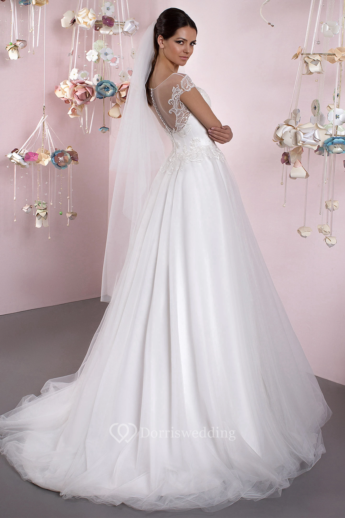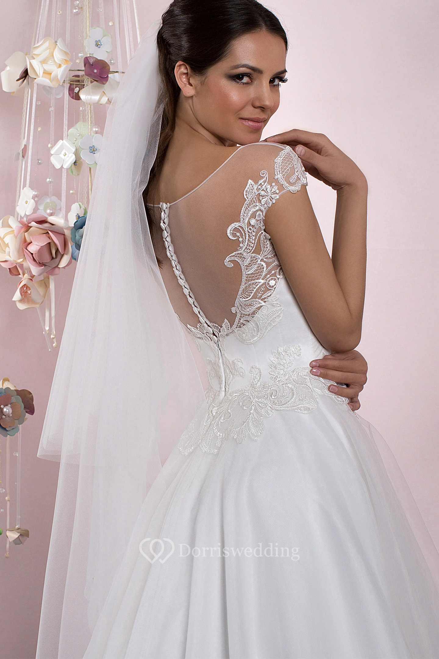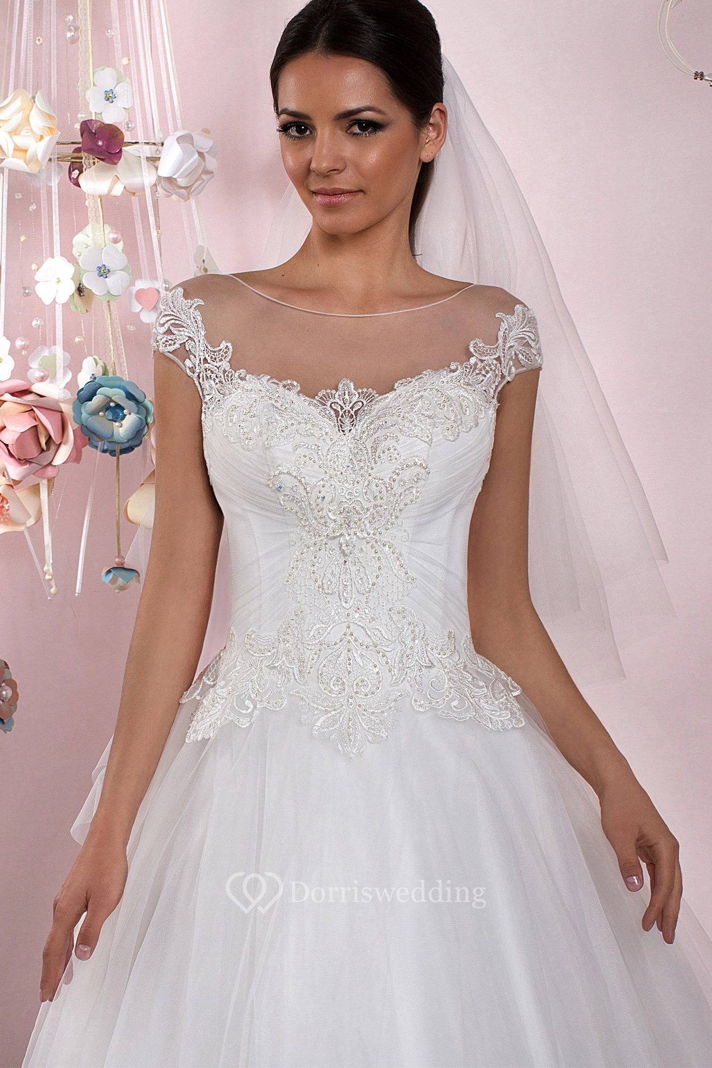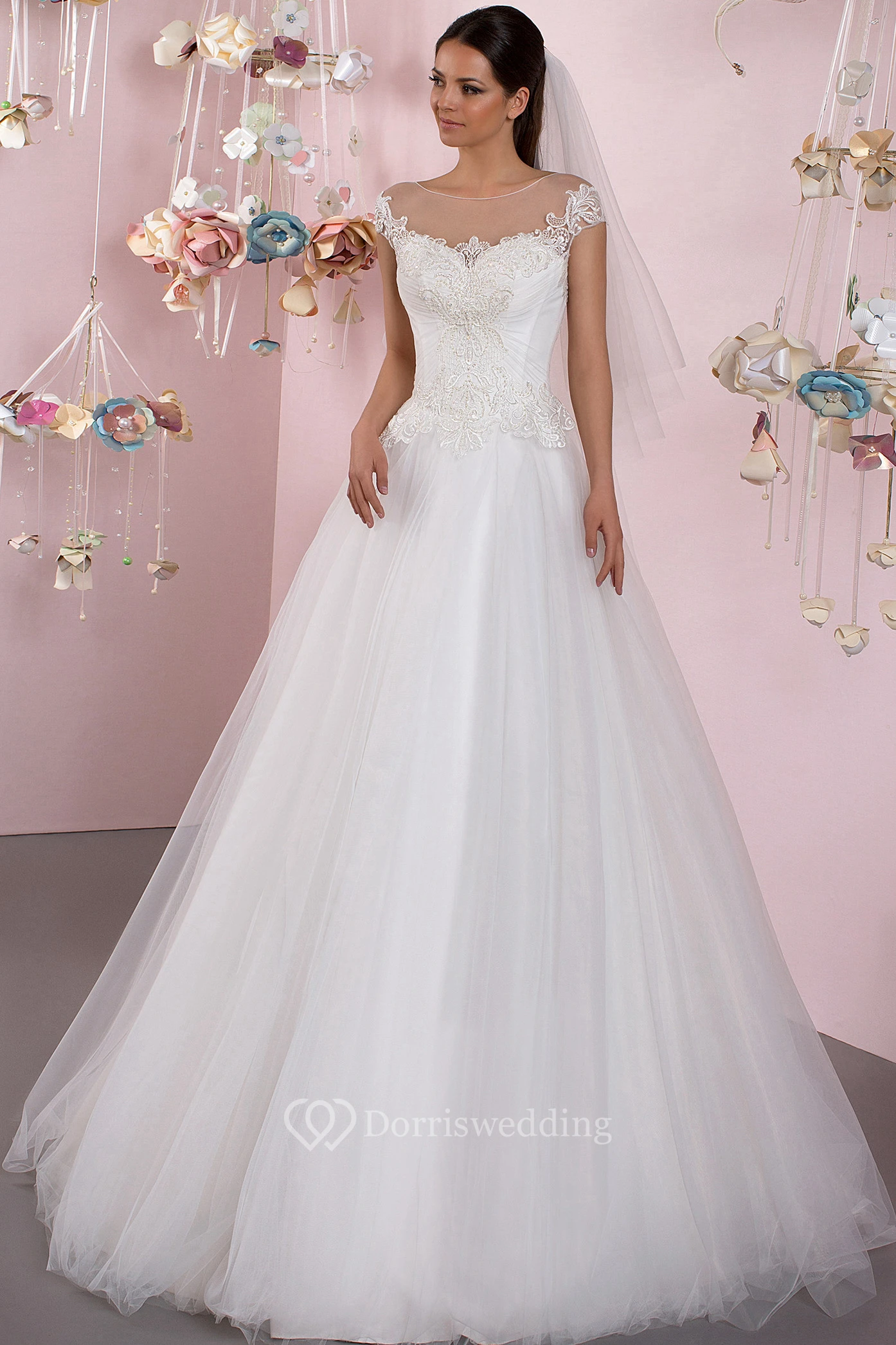 A-Line Cap Sleeve Appliqued Scoop Neck Tulle Wedding Dress
