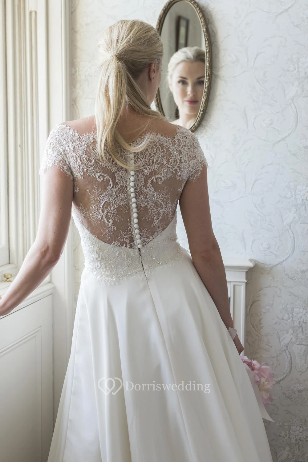 A-Line Cap-Sleeve Bateau-Neck Satin Wedding Dress With Lace And Illusion