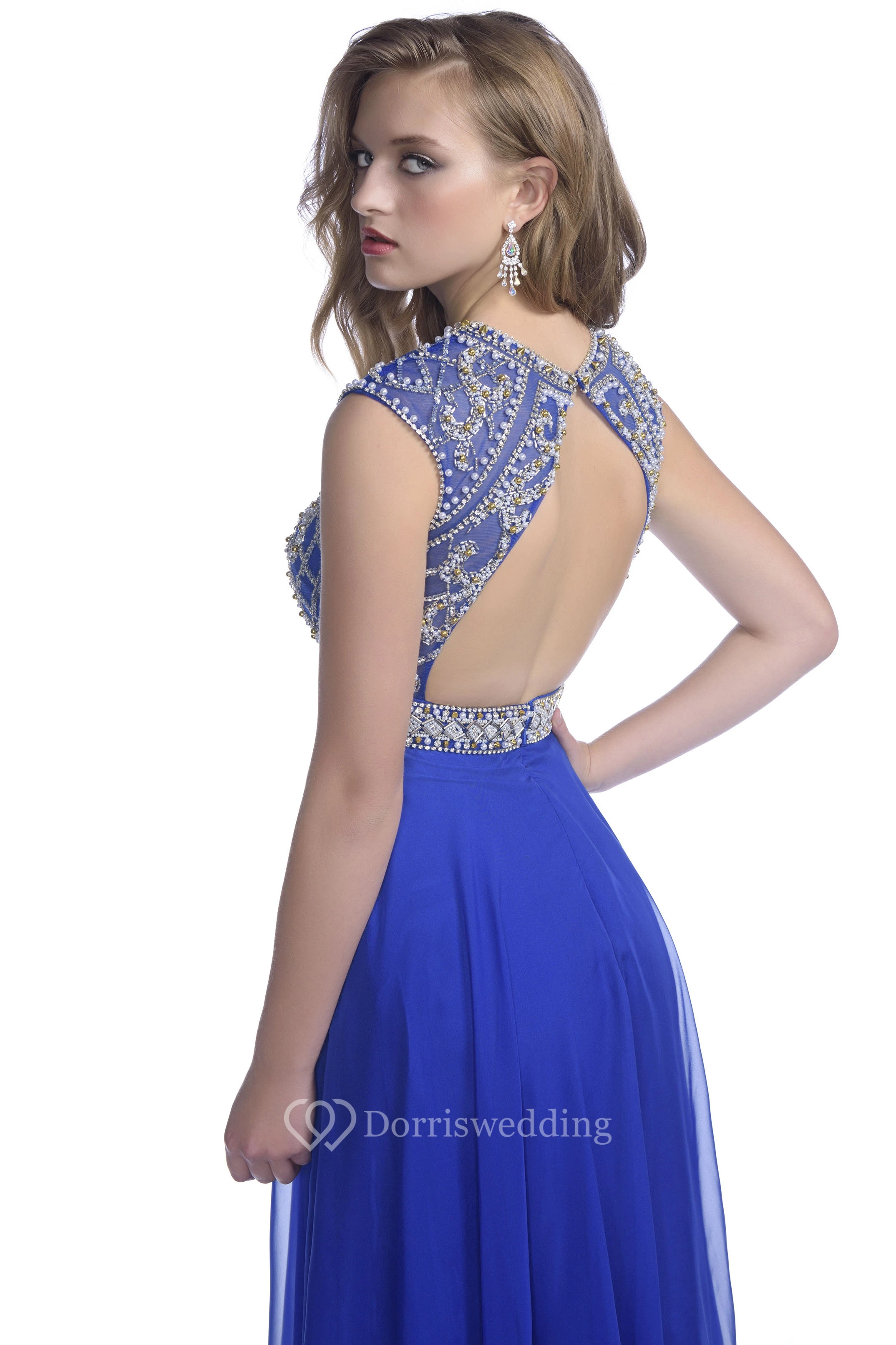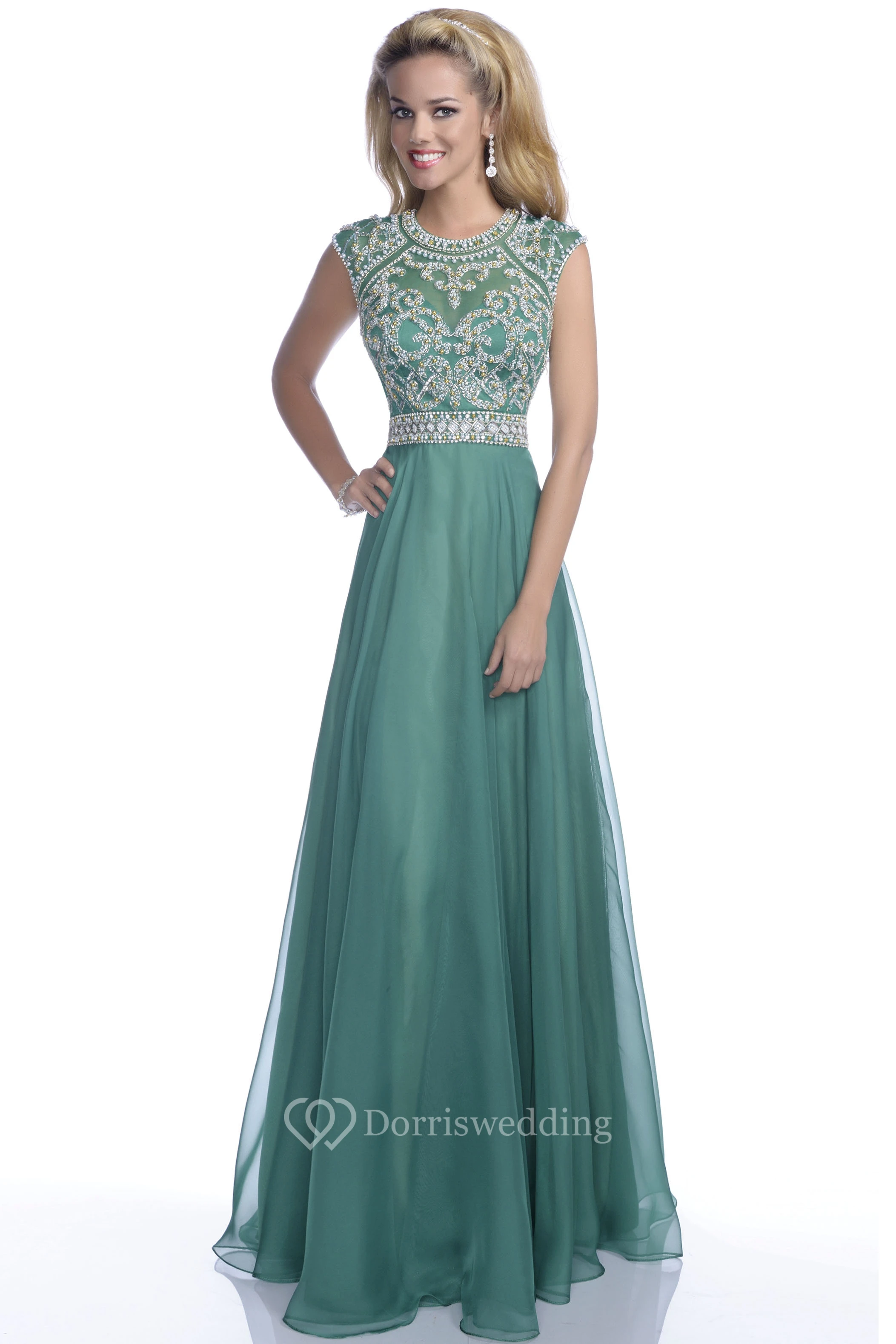 A-Line Cap Sleeve Chiffon Keyhole Back Prom Dress With Crystal Bodice And Belt