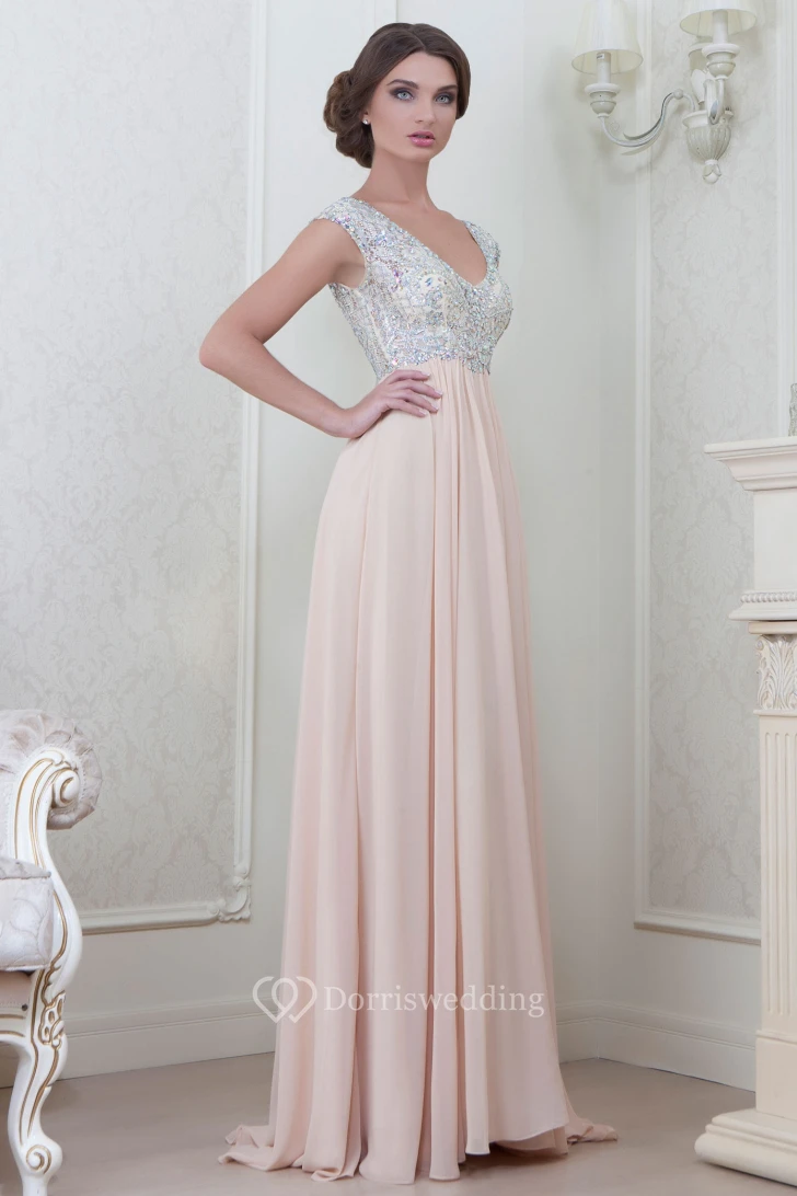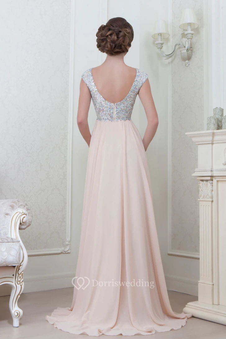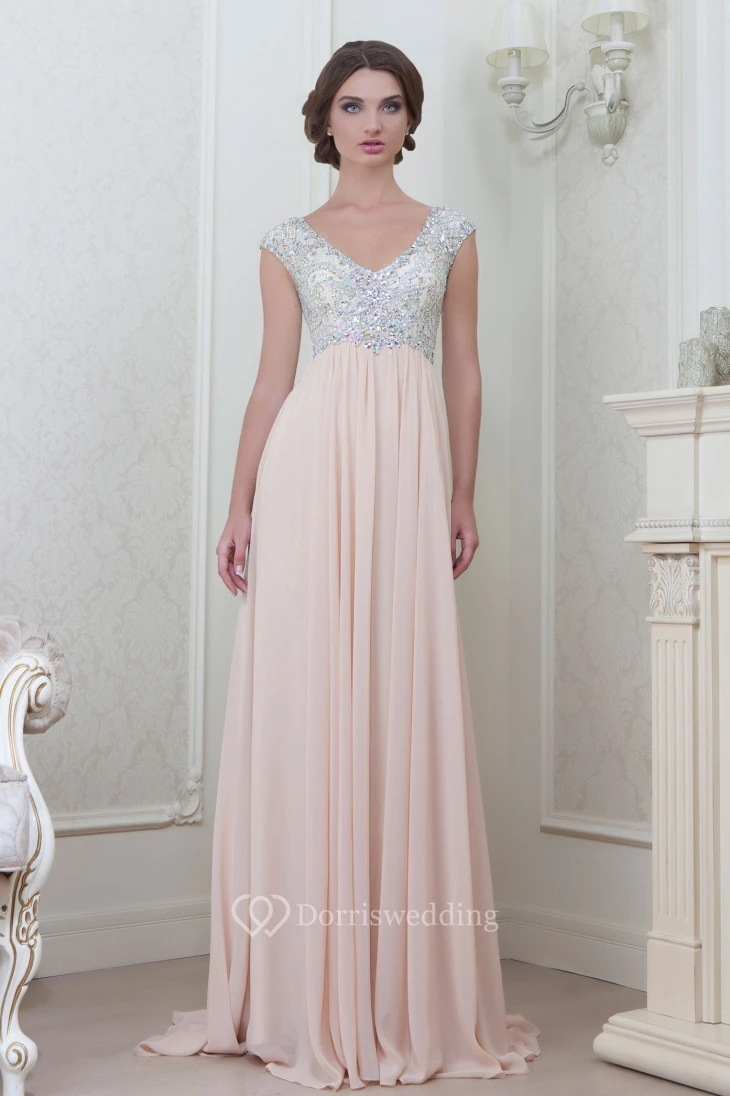 A-Line Cap-Sleeve Empire V-Neck Floor-Length Beaded Chiffon Evening Dress With Pleats