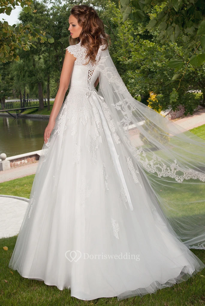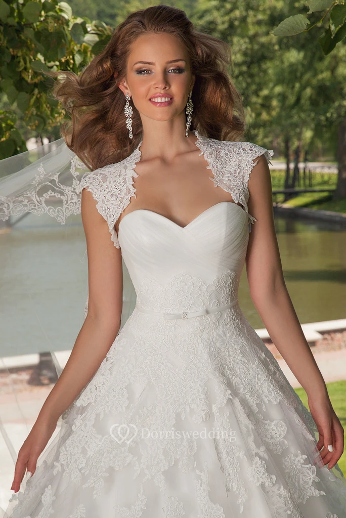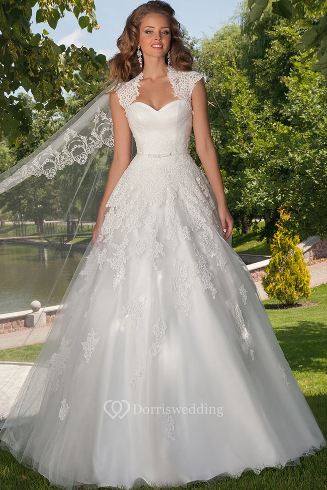 A-Line Cap-Sleeve Floor-Length Ruched Sweetheart Tulle Wedding Dress Styles With Appliques And Cape