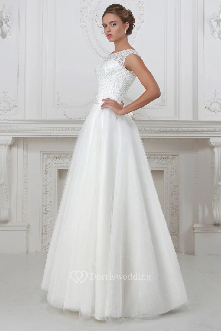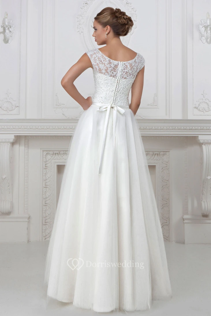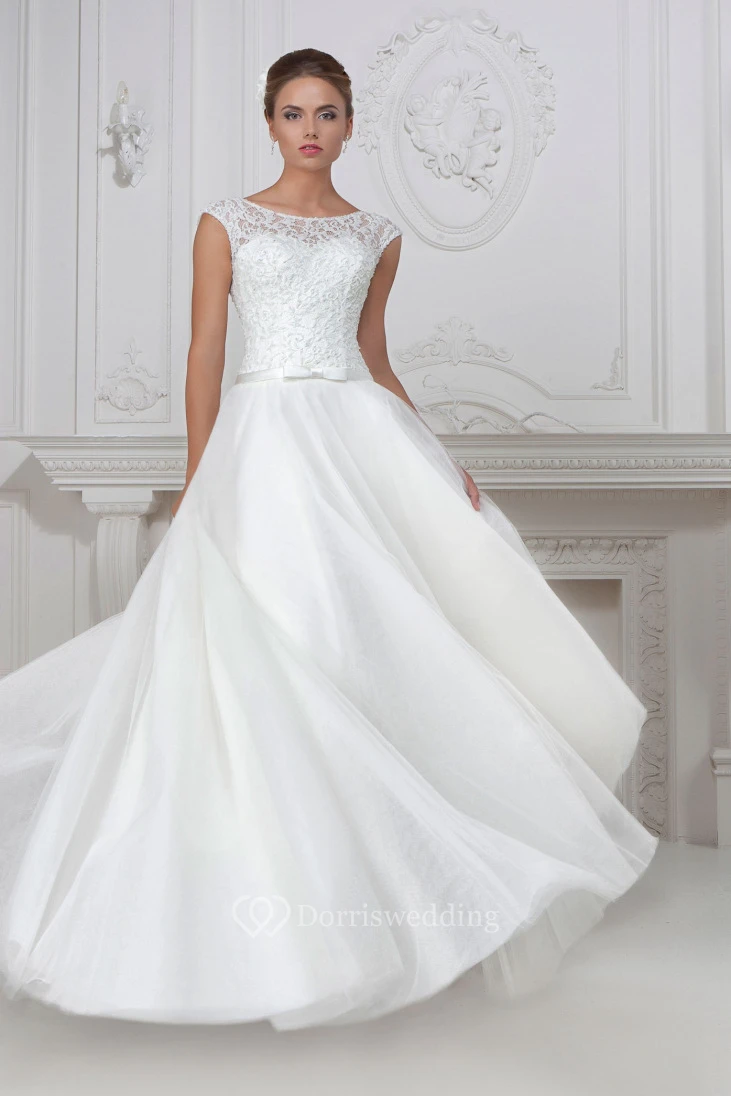 A-Line Cap-Sleeve Floor-Length Scoop-Neck Lace&Tulle&Satin Wedding Dress