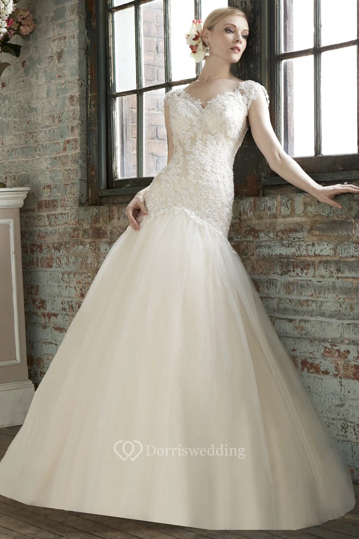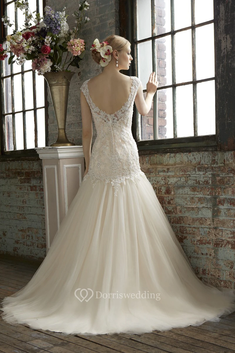 A-Line Cap-Sleeve Floor-Length V-Neck Tulle&Lace Wedding Dress With Appliques And V Back