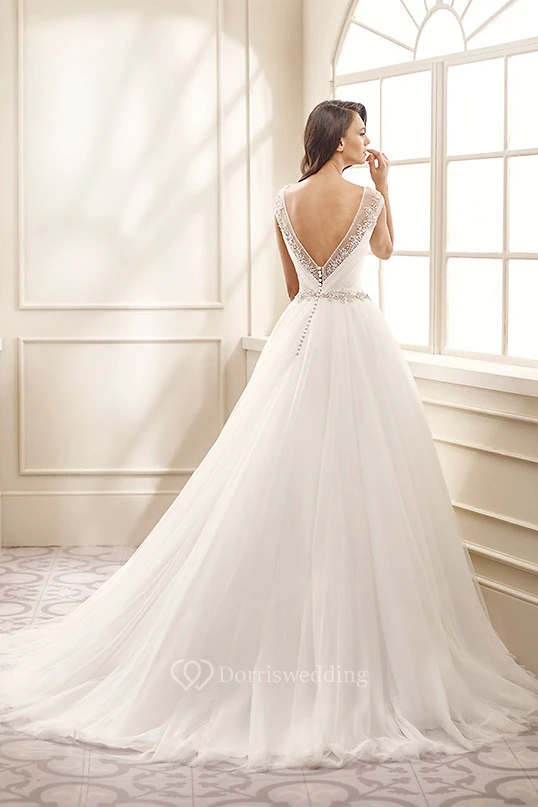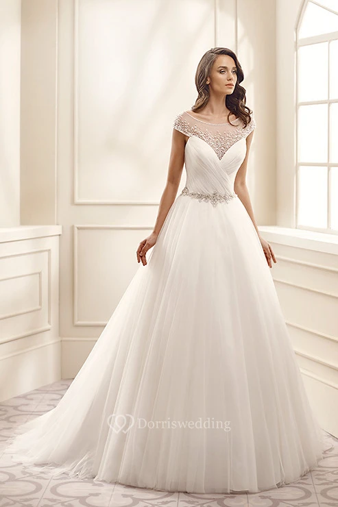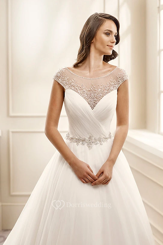 A-Line Cap-Sleeve Scoop-Neck Floor-Length Beaded Tulle Wedding Dress With Criss Cross And Waist Jewellery