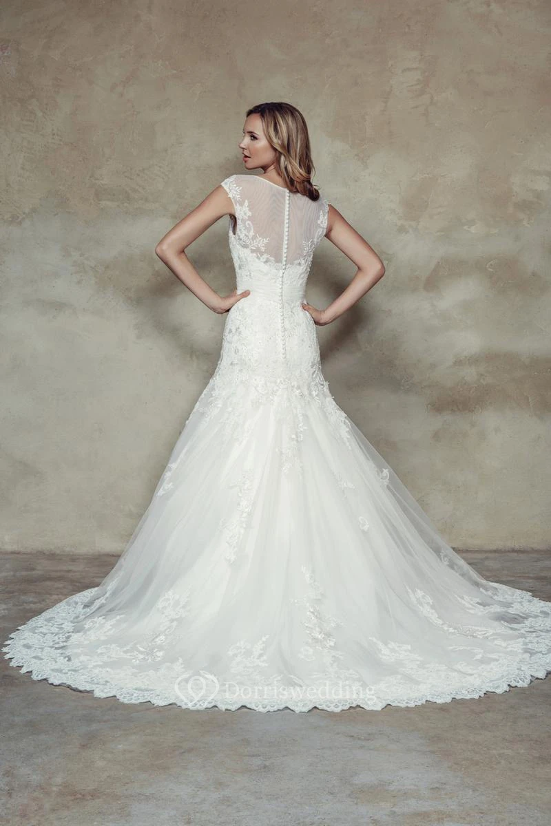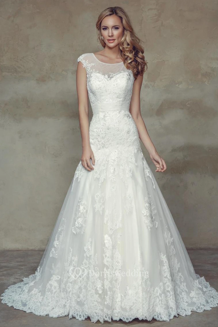 A-Line Cap-Sleeve Scoop-Neck Lace Wedding Dress With Illusion