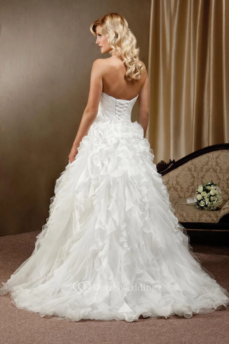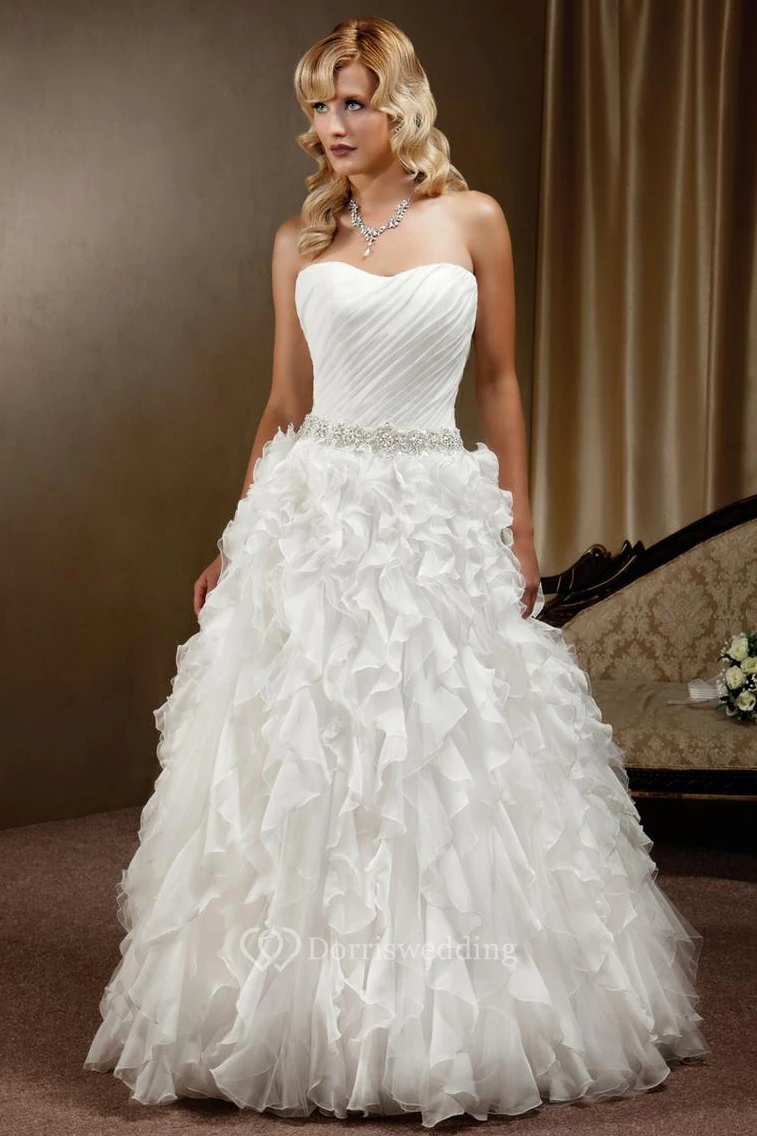 A-Line Cascading-Ruffle Sleeveless Strapless Floor-Length Chiffon Wedding Dress With Waist Jewellery And Ruching