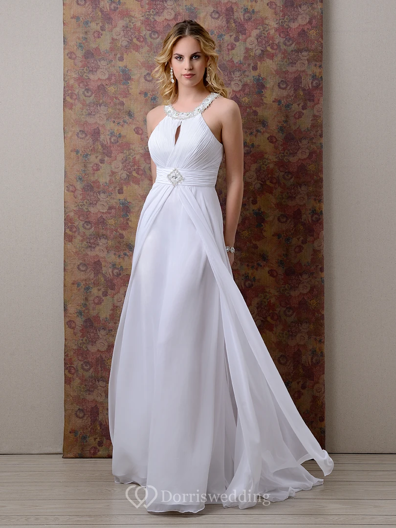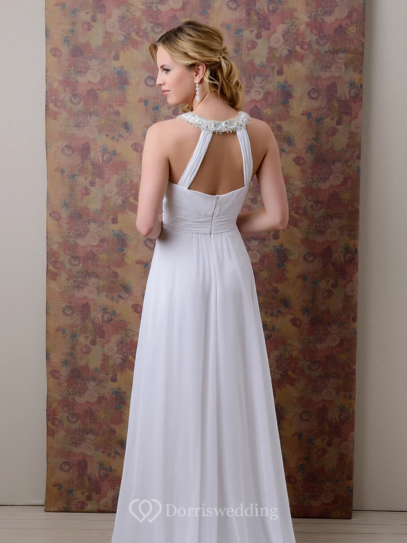 A-Line Chiffon Beaded Neck Wedding Dress With Ruching And Keyhole