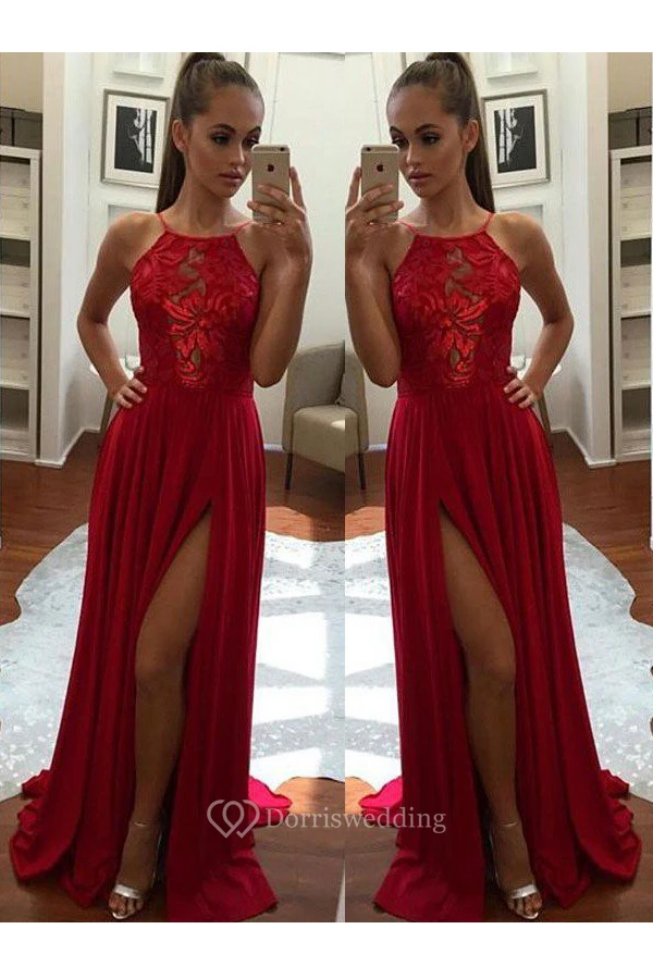 A-Line Chiffon Lace Spaghetti Sleeveless Zipper Dress