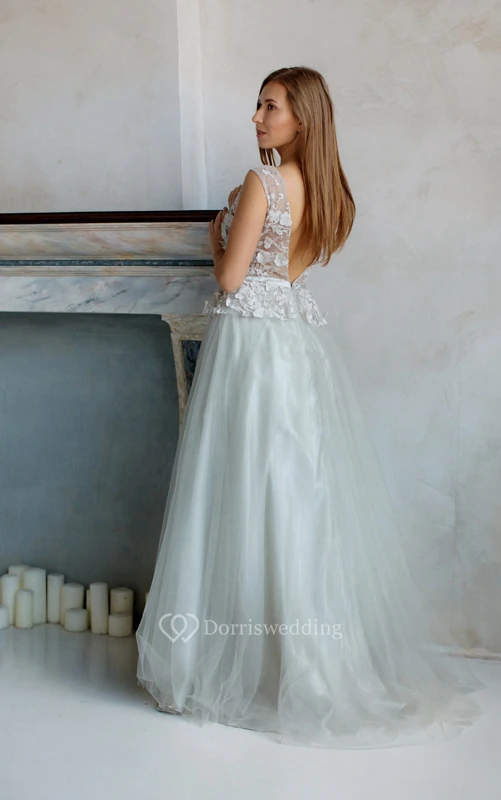 A-Line Court Train Jewel Short Sleeve Tulle Lace Pleats Low-V Back Dress