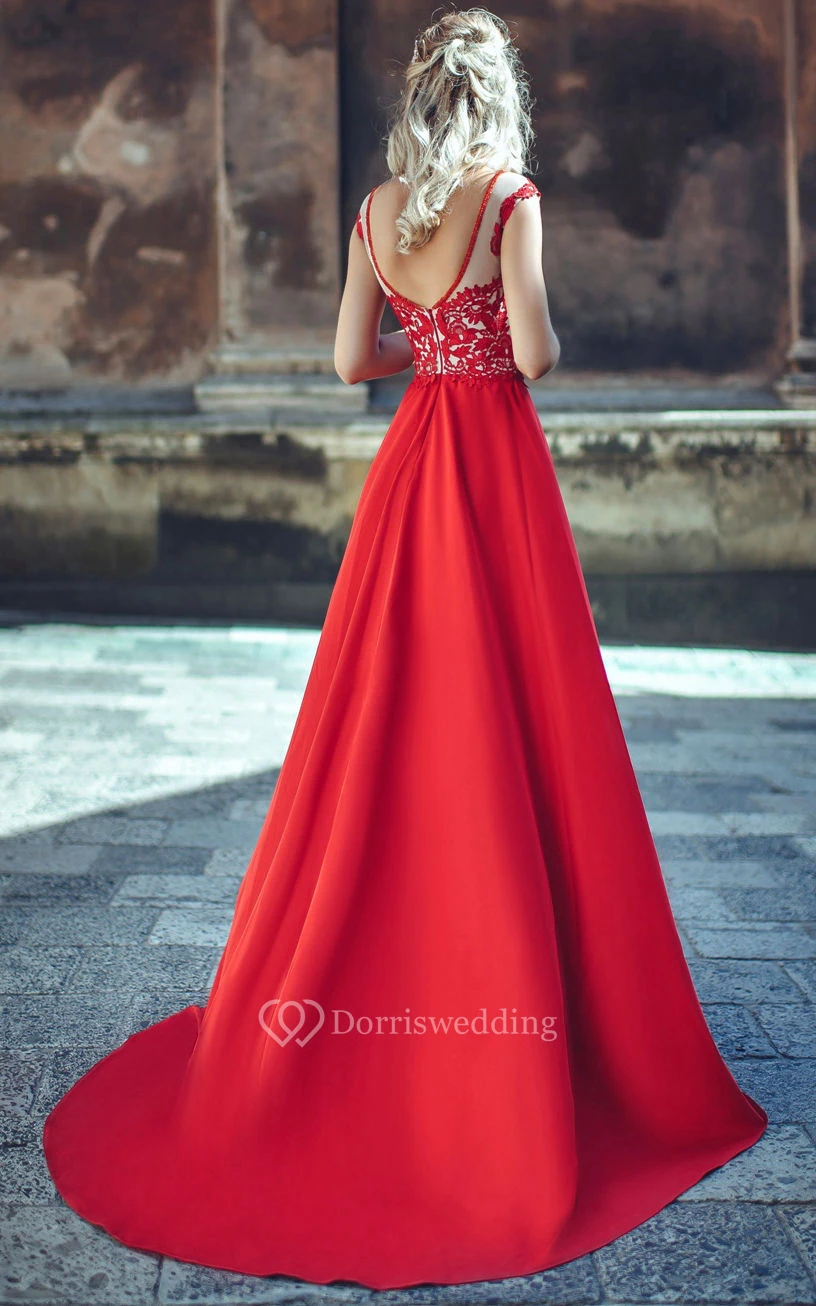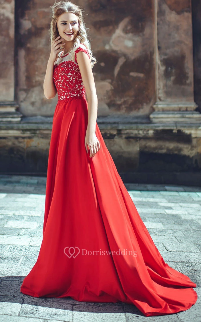 A-Line Court Train Jewel Sleeveless Satin Appliques Pleats Low-V Back Dress