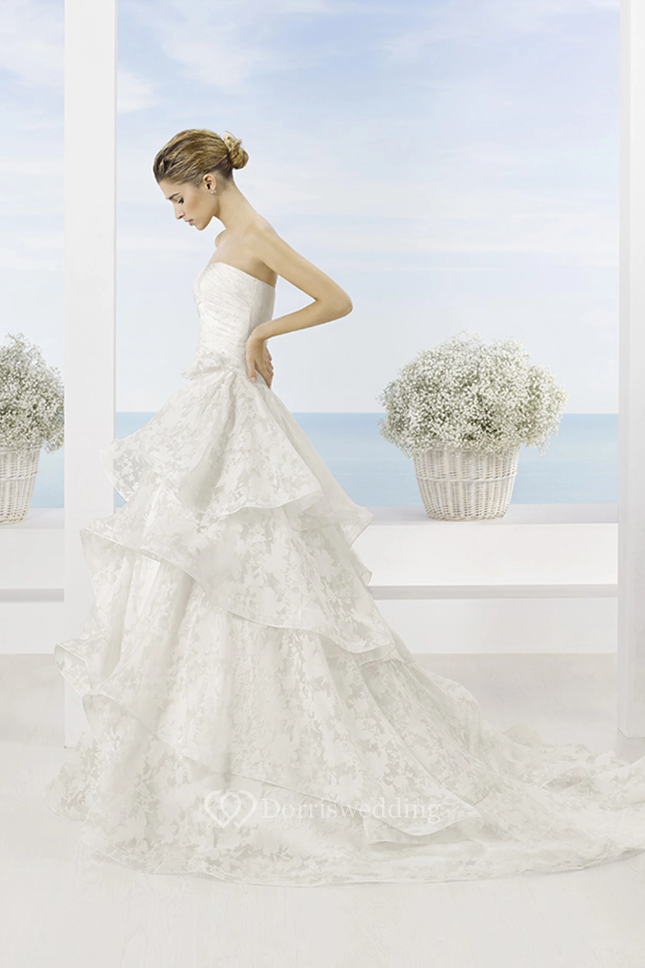 A-Line Draped Strapless Floor-Length Sleeveless Wedding Dress With Tiers And Flower