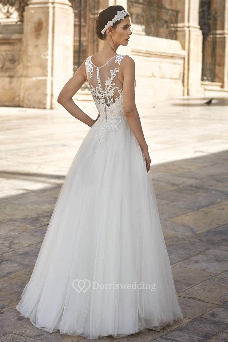 A-Line Embroidered Sleeveless Floor-Length Scoop-Neck Tulle Wedding Dress With Pleats