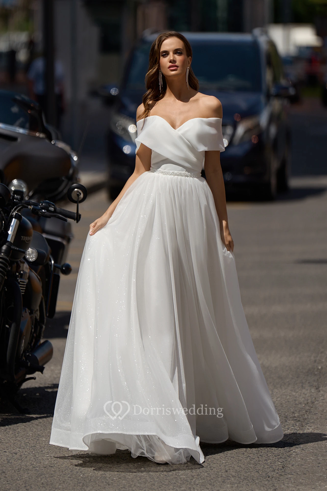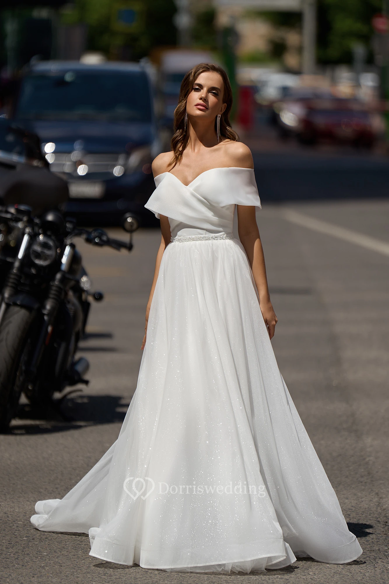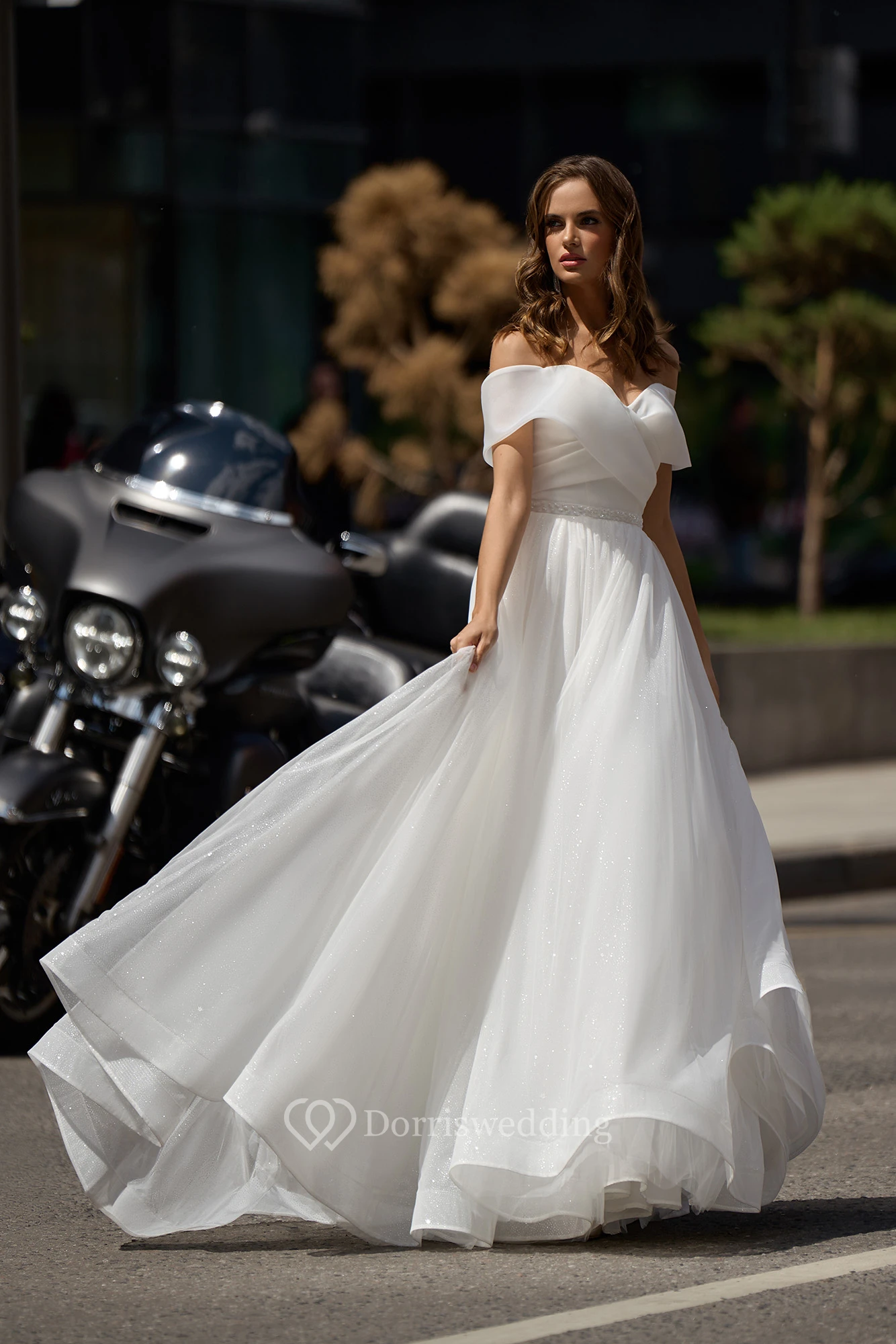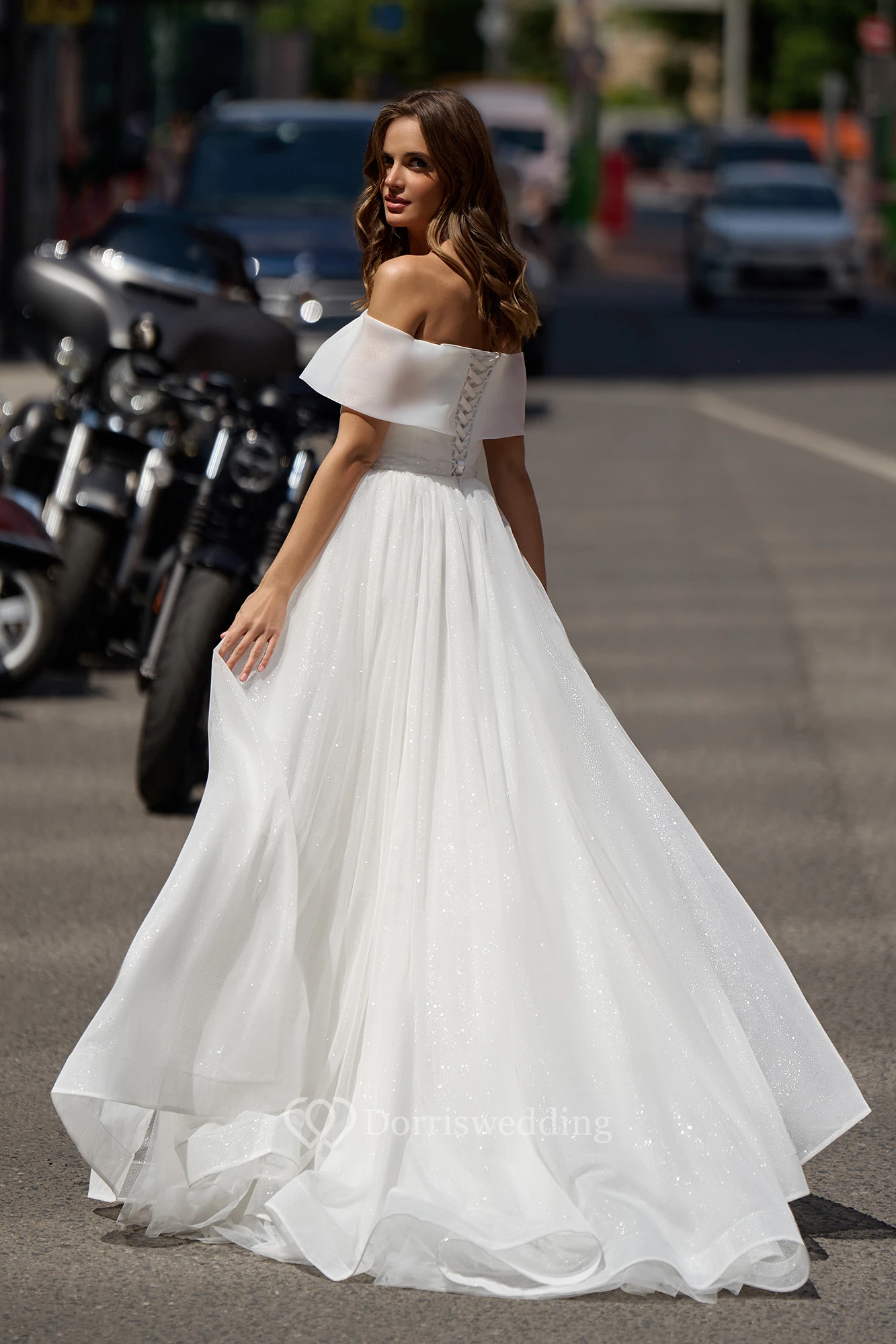 A-line Empire Off-the-shoulder Tulle Sequin Wedding Dress