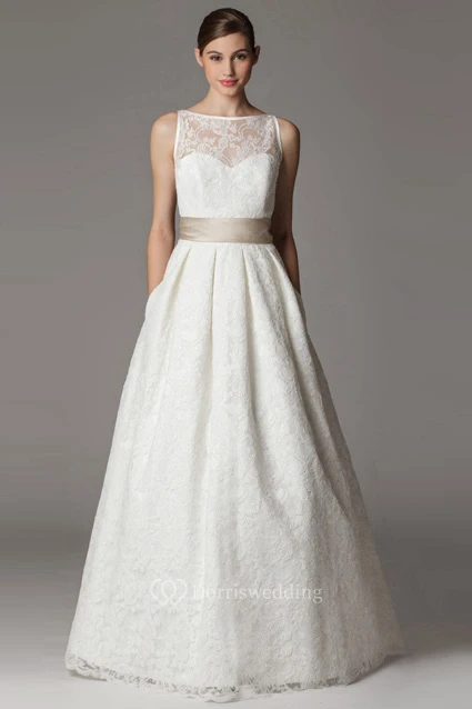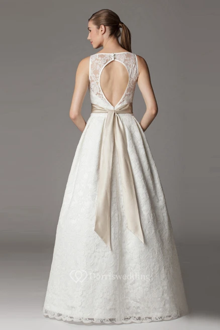 A-Line Floor-Length Appliqued Bateau-Neck Sleeveless Lace Wedding Dress With Bow