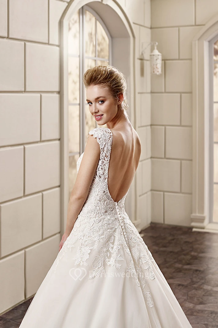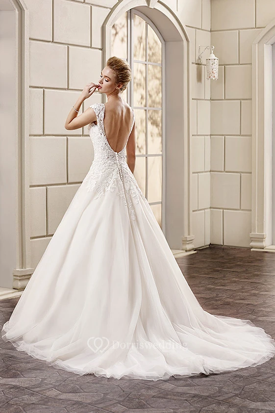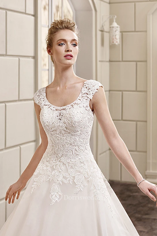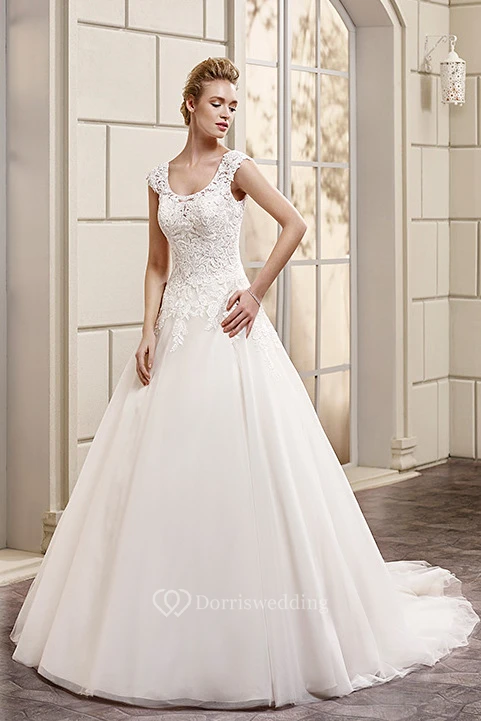 A-Line Floor-Length Appliqued Cap-Sleeve V-Neck Lace&Satin Wedding Dress With Pleats