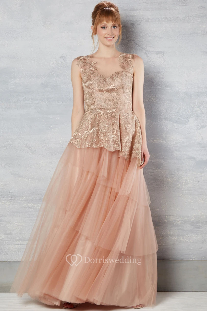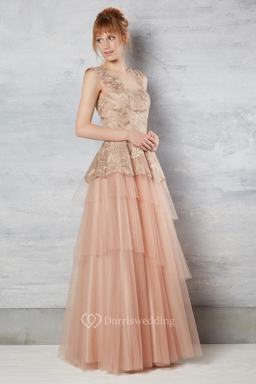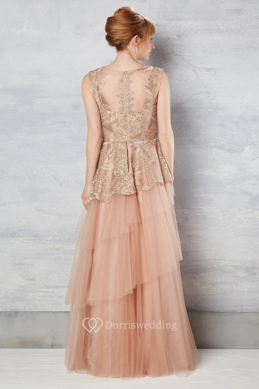 A-Line Floor-Length Appliqued Sleeveless Tulle Wedding Dress With Tiers And Illusion Back