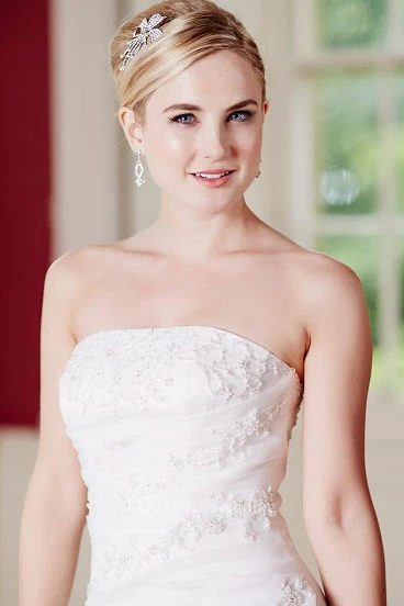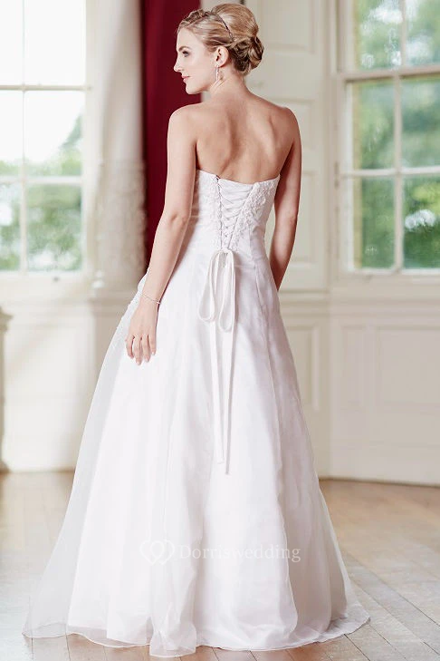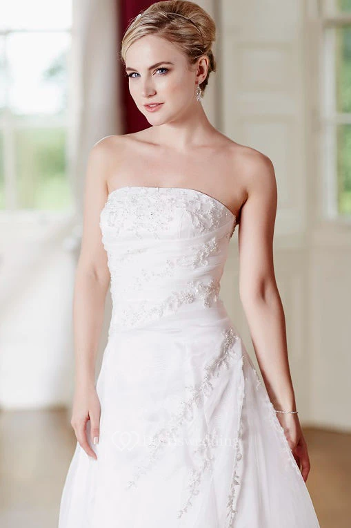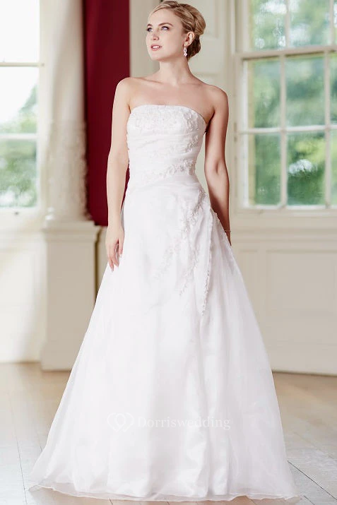 A-Line Floor-Length Appliqued Strapless Sleeveless Satin Wedding Dress With Lace-Up Back And Side Draping