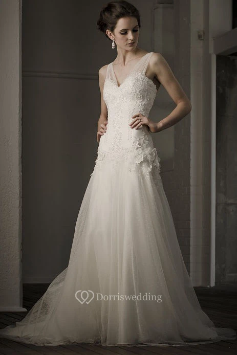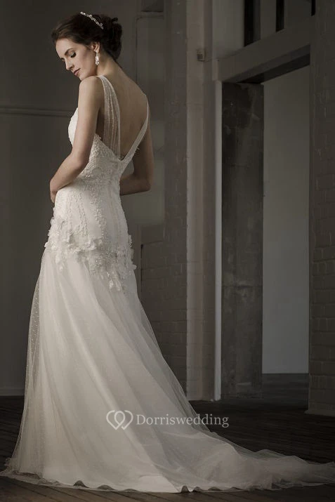 A-Line Floor-Length Appliqued V-Neck Sleeveless Tulle Wedding Dress With Deep-V Back And Flower
