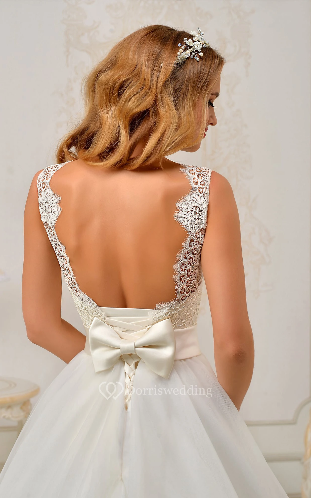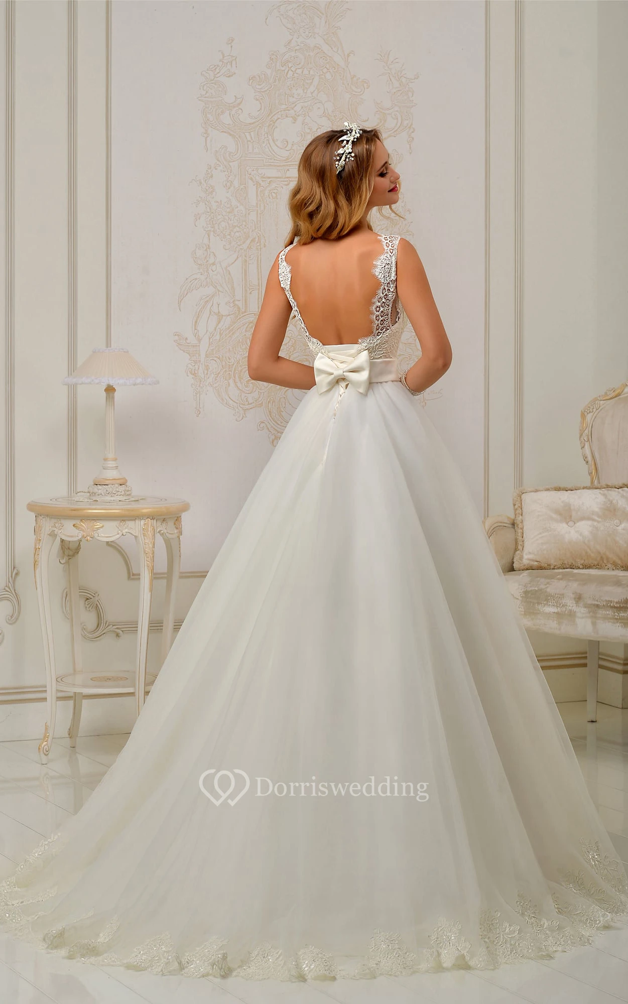 A-line Floor-length Appliques Backless Lace&Tulle Dress With Bow
